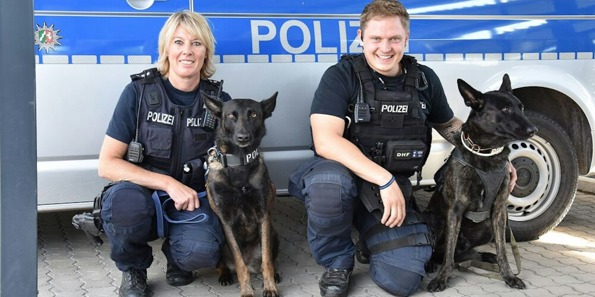 Die Kommissare Elke Laegner und Marius Mohaupt mit ihren Rauschgiftspürhunden Fräulein Smilla und Tay.