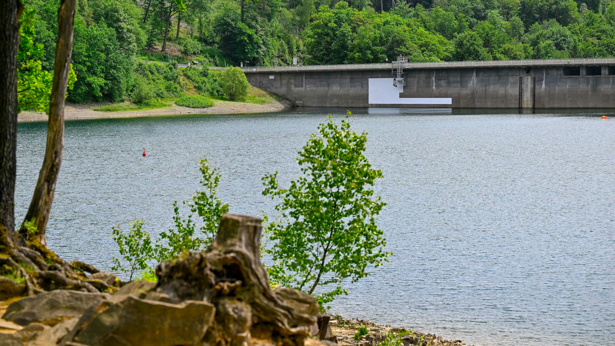 Der Blick von der Halbinsel auf die Staumauer der Aggertalsperre, wo das E von „Echo“ bereits zu erkennen ist.
