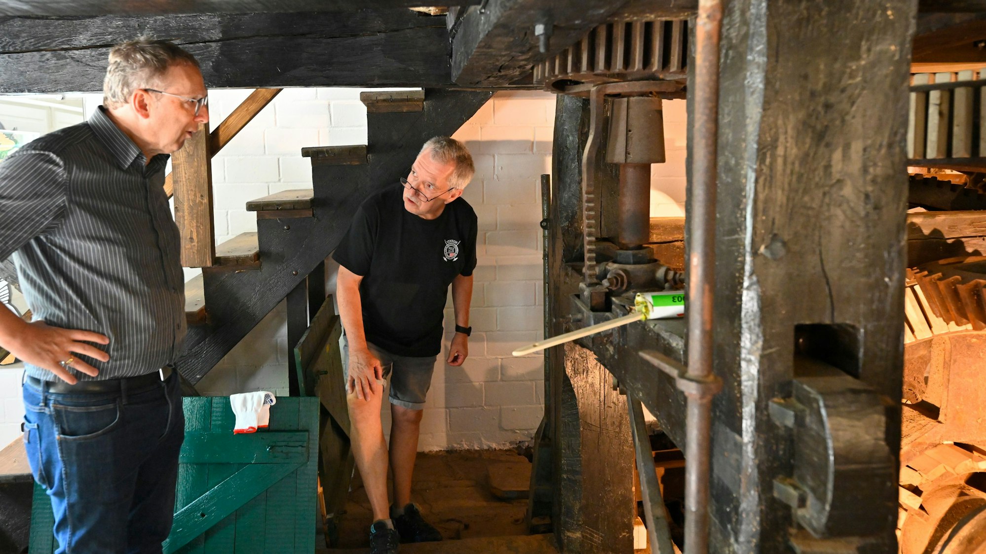 Im Innern wurde das historische Mühlwerk überholt. Das Ergebnis schauten sich am Montag Jürgen Hefner (l.) und Uwe Jacobs an.