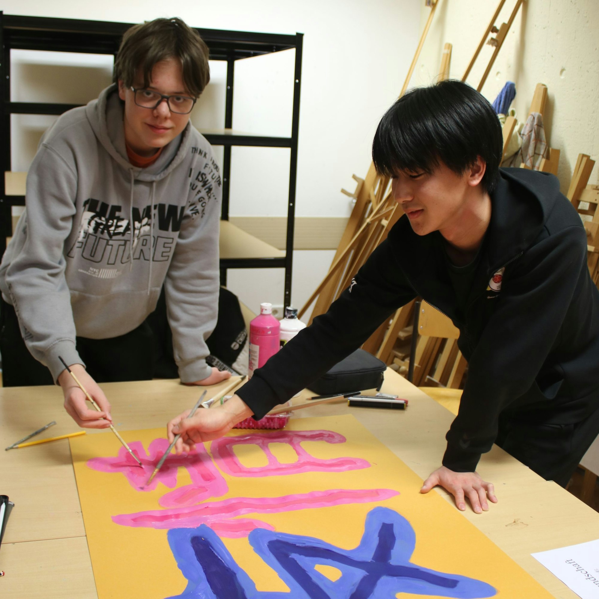 Japanische Handballer im Kunstunterricht an der Gesamtschule Marienheide.
