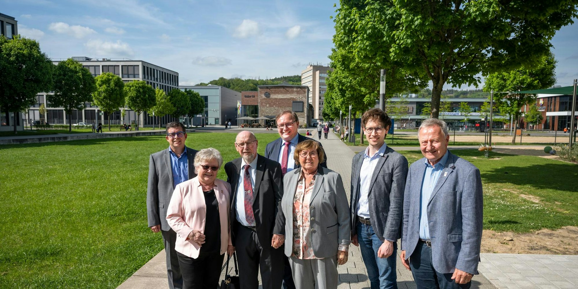 Hans-Egon und Gertrud Häring (3. und 5. v.l.) mit (v.l.) Frank Helmenstein, Beate Ruland, Thorsten Konzelmann, Sven Lichtmann und Friedhelm Julius Beucher auf dem Steinmüllergelände.