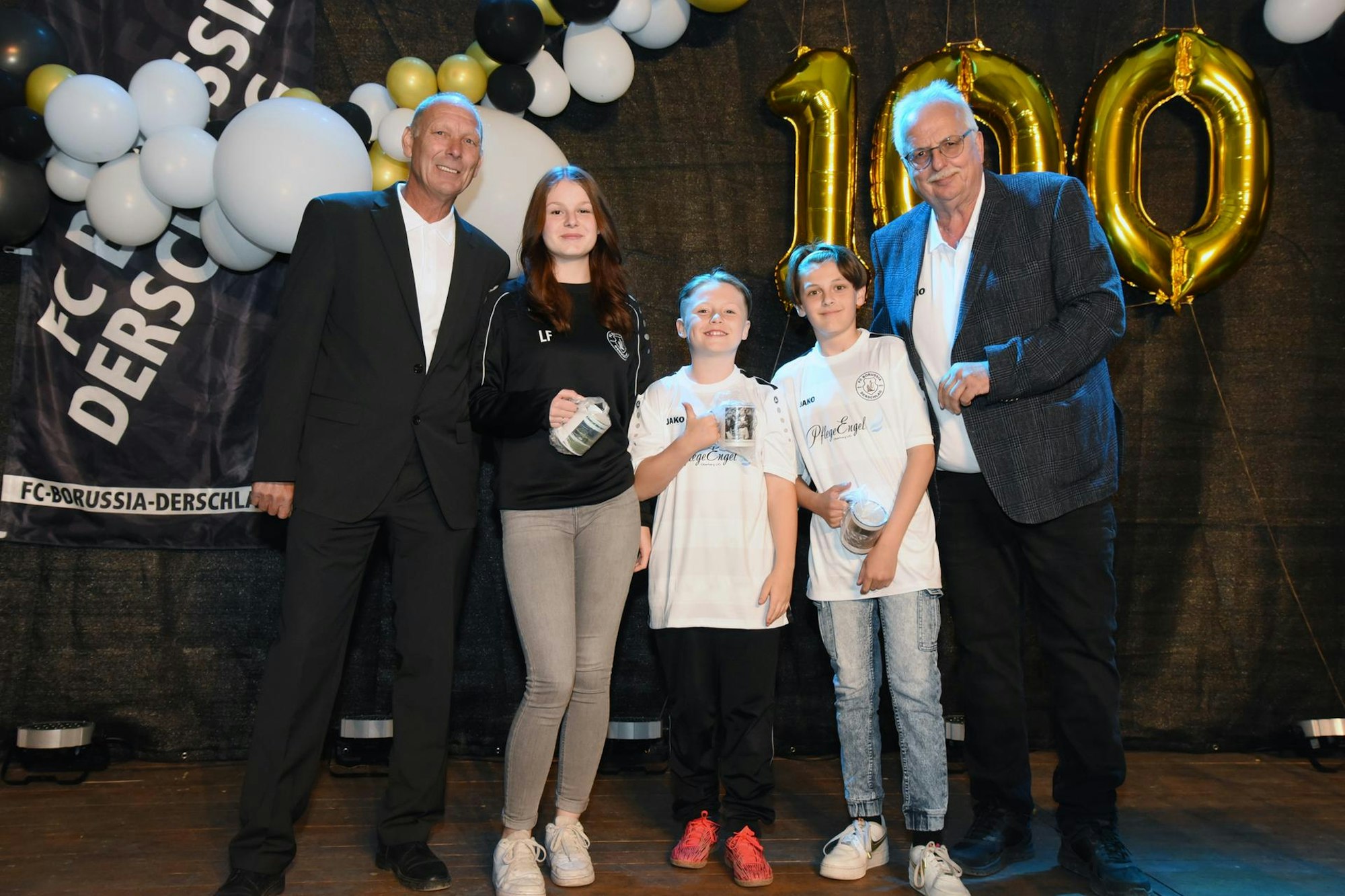 Derschlag – Mit zwei Jahren Verspätung hat der FC Borussia Derschlag am Wochenende sein 100-jähriges Bestehen gefeiert. Am Samstagabend gab es kölsche Musik im Festzeit und am Sonntag stand die Familie im Mittelpunkt des Programms. Eingeläutet wurden die dreitägigen Feierlichkeiten mit dem Festkommers am Freitag. Und wenn ein Traditionsverein wie der FC Borussia Derschlag ruft, kommen viele Gäste. „Wir sind zwar nur ein kleiner Kreisliga-B-Verein, aber unser Festzelt mit allem Drum und Dran hat Oberliga-Niveau“, frohlockte Geschäftsführer Peter Wagner, der die Besucher gemeinsam mit dem Vorsitzenden Steffen Fastenrodt begrüßte. Parallel dazu liefen bewegte Bilder der ruhmreichen Geschichte der Borussia über die Bildschirme im Zelt.