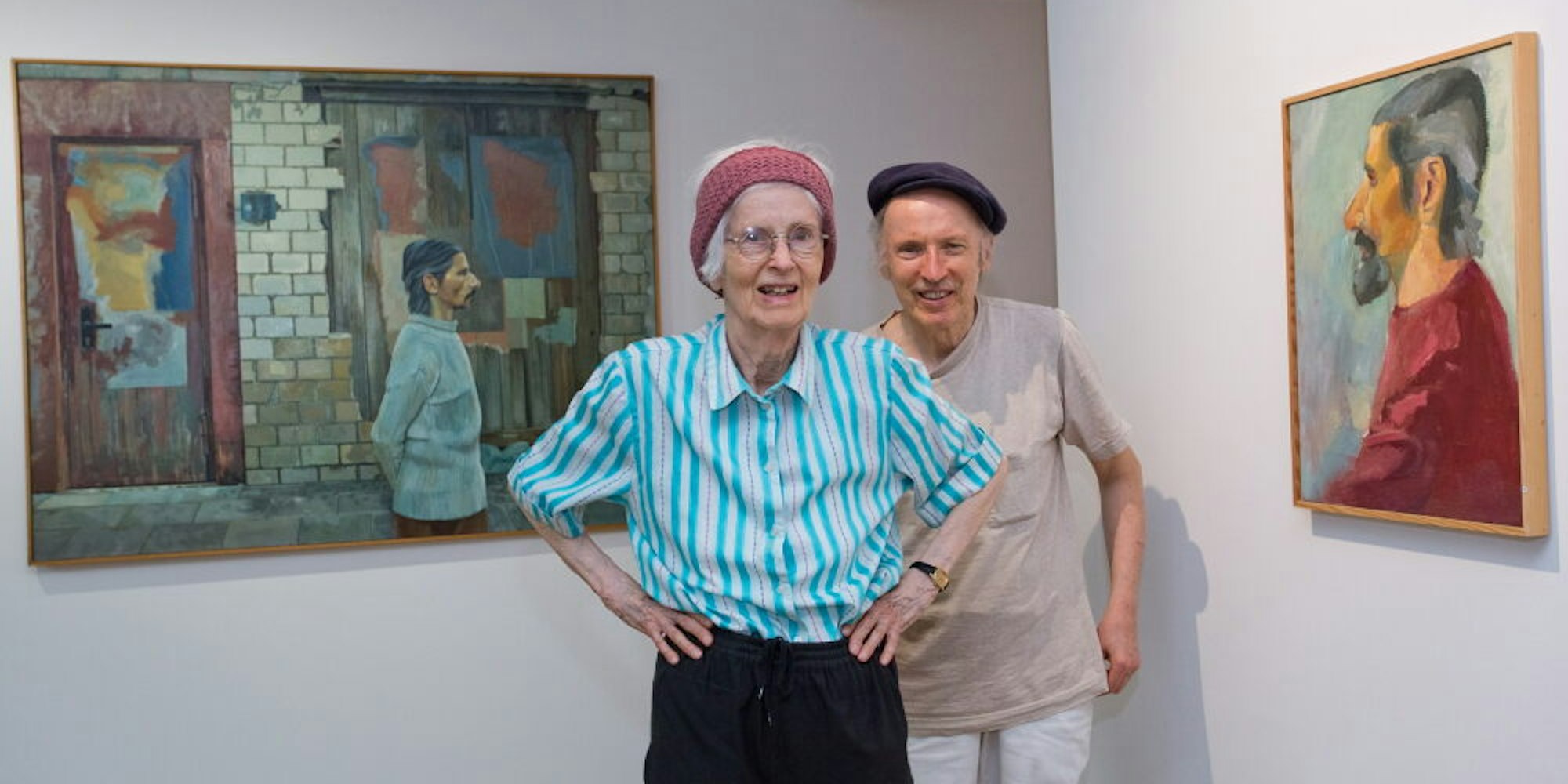 Künstlerin Roswitha Waechter mit Ehemann Michael Mohr vor einem der Bilder des Findelkinds Urban Maatbach.