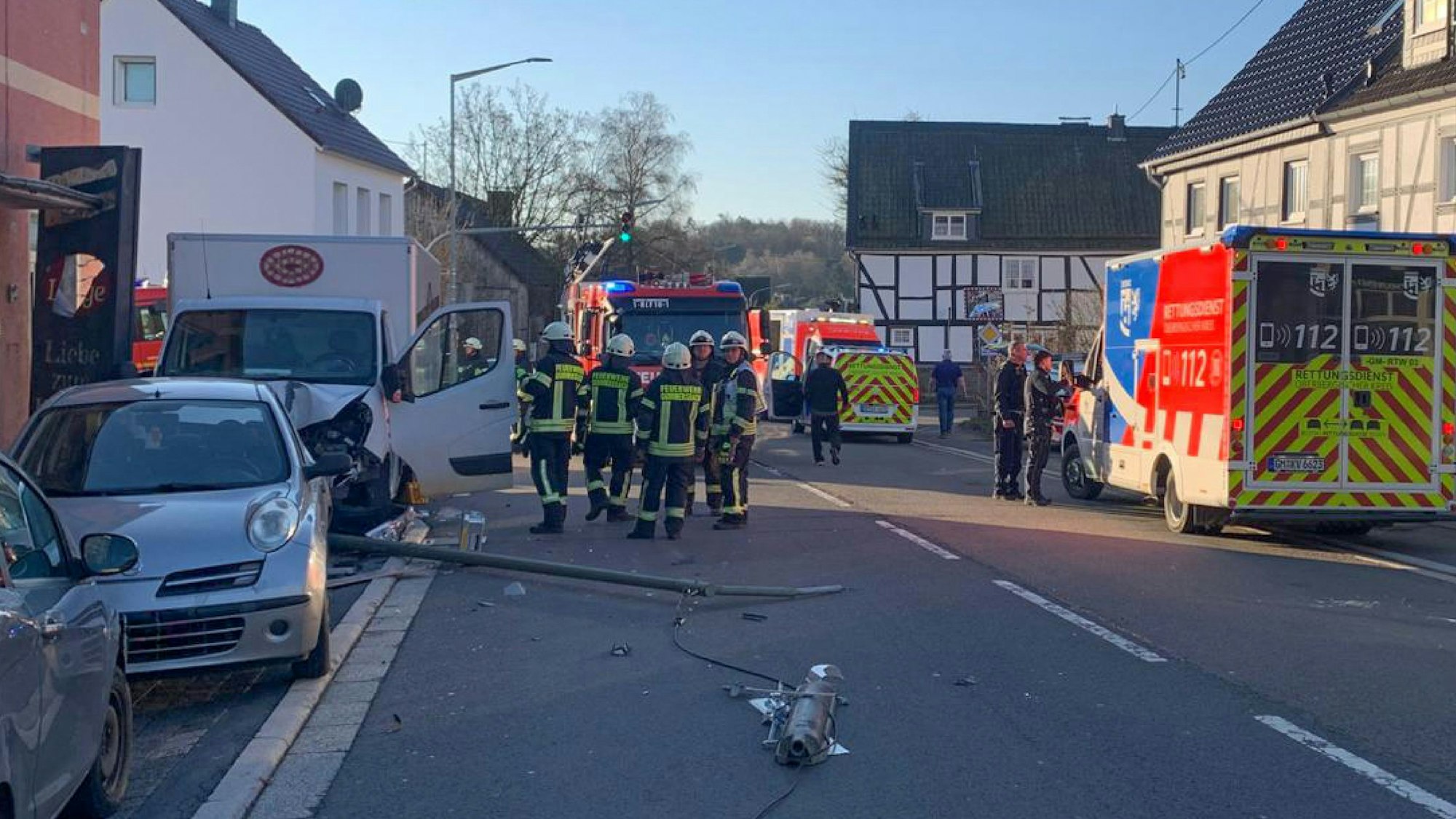 Die Unfallaufnahme in Windhagen dauert an. Laut Polizei ist eine weitere Person leicht verletzt worden. Zu dem Unfall soll es gekommen sein, als der Fahrer eines Kleinlastwagens in Höhe der Burgstraße nach rechts von der Fahrbahn abgekommen ist und dort mit einem weiteren Auto kollidierte. Und er Folge wurden zwei weitere Autos in den Unfall verwickelt. Zudem knickte ein Strommasten um.