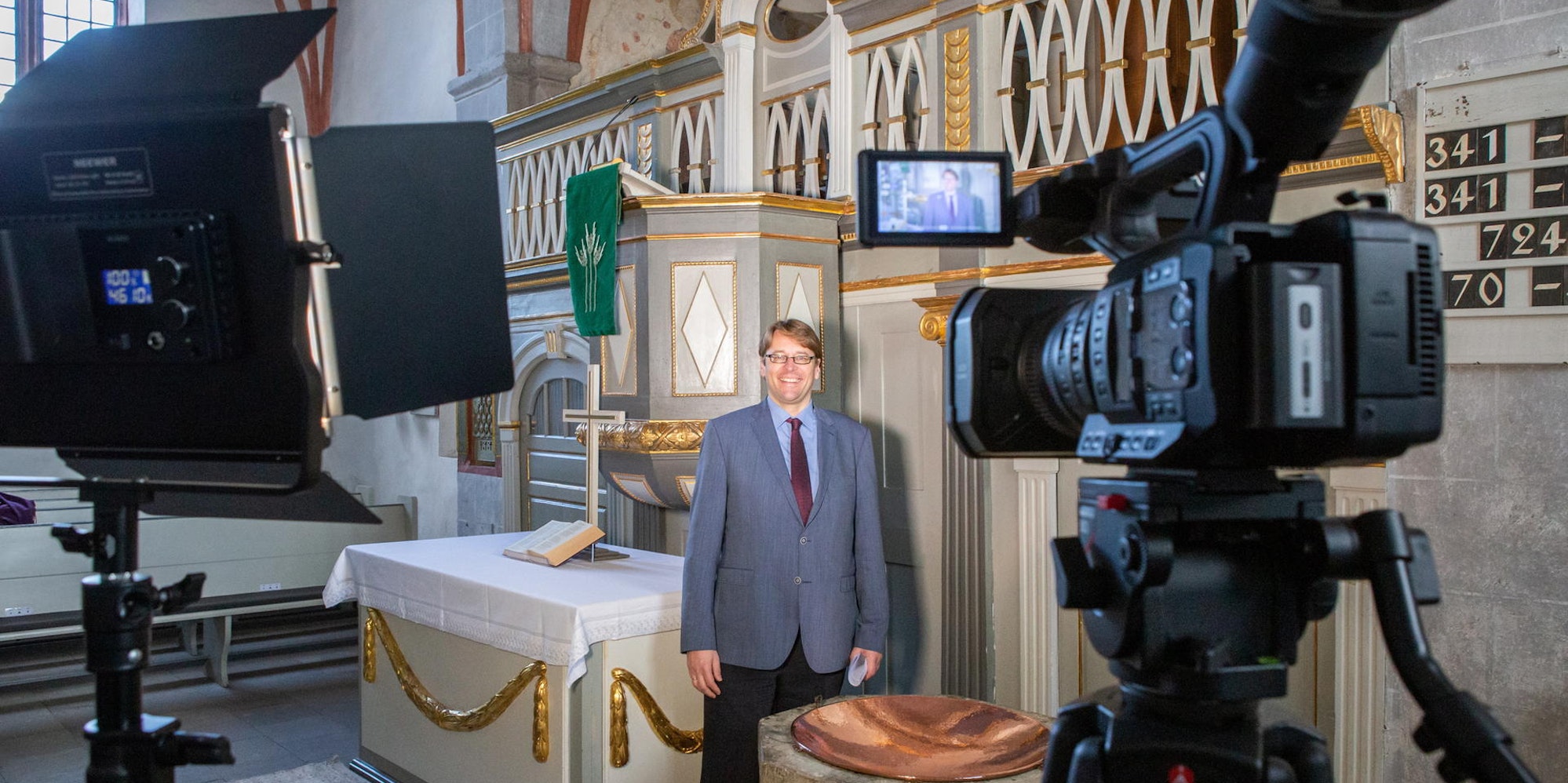 Zwar fehle diesmal das Miteinander, das Wiedersehen, die sozialen Kontakte, bedauert er. Aber: Neue, kreative Wege in der besonderen Situation seien gefragt – und warum sollte man da nicht auch die medialen Vorteile nutzen? So wurden bereits die Videos mit der Vorstellung der Kandidierenden für den Kreissynodalvorstand und die stellvertretenden Landessynodalen aufgenommen, stimmungsvoll in Szene gesetzt vor einem großen goldenen Kreuz in den Räumen des Kirchenkreises. „Einige waren ganz souverän, andere mussten sich erstmal mit der ungewohnten Situation vor der Kamera anfreunden“, verrät Klaus Dripke, der für die Aufnahmen und den Schnitt des Materials verantwortlich ist.