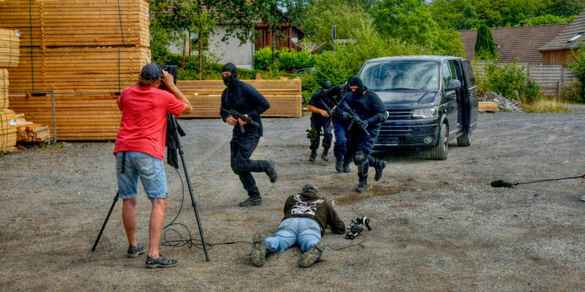 Eine kurze Szene zu drehen dauert: Die Sonne scheint zu stark, eine Wolke erscheint im unpassenden Moment, ein Auto auf der Straße macht Lärm, ein Treckerfahrer wirft erstaunte Blicke auf das Geschehen, eine echte Polizeistreife fährt vorbei, im Sägewerk wird gehämmert. Perfektionist Torsten Schördling lässt seinen Schwiegersohn Michel Jungjohann, der den Einsatzleiter spielt, immer wieder aus dem Polizeibus aussteigen, bis wirklich jede Bewegung stimmig ist. Mit dem Hilchenbacher Kameramann Rainer Frenzen hat der Filmemacher schon mehrfach zusammengearbeitet – beide verstehen sich ohne große Worte. Christine Bretz, Schauspielerin und Regisseurin aus Bergneustadt, achtet ebenfalls auf kleinste Gesten und gibt Hinweise.