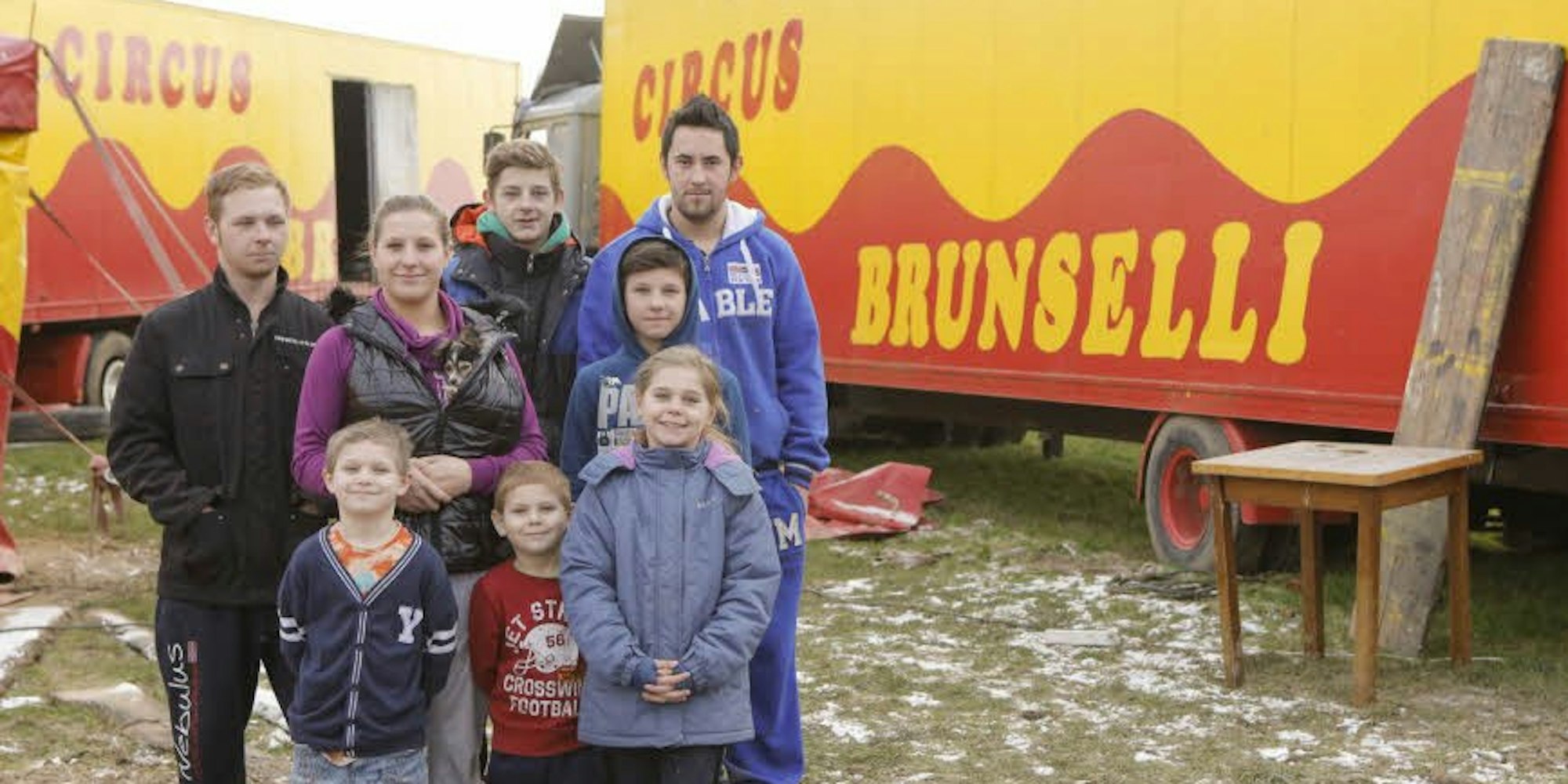 Die sieben Kinder des Circus Brunselli (hinten v.l.): Anthony, Madeleine, Jeffyrey, Miguel, dazu Schwiegersohn Renaldo Bügler (hinten rechts) und (vorne v.l.) Sergio, Diego und Sydney.
