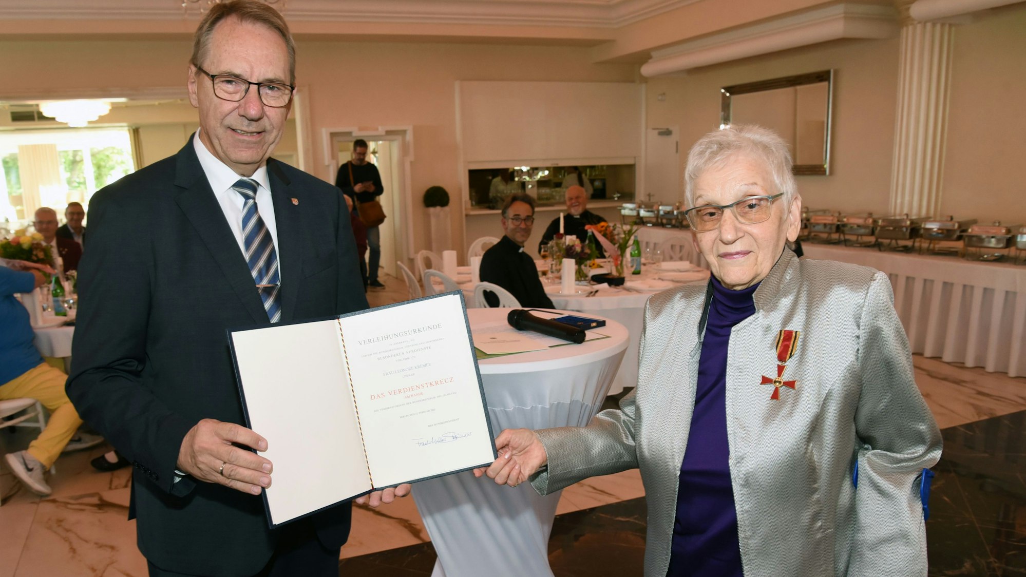 Seit 45 Jahren setzt sich Leonore Kremer für das Alphabetisierungshilfswerk Opam ein. Landrat Jochen Hagt zeichnete Kremer an ihrem 80. Geburtstag mit dem Bundesverdienstkreuz aus.