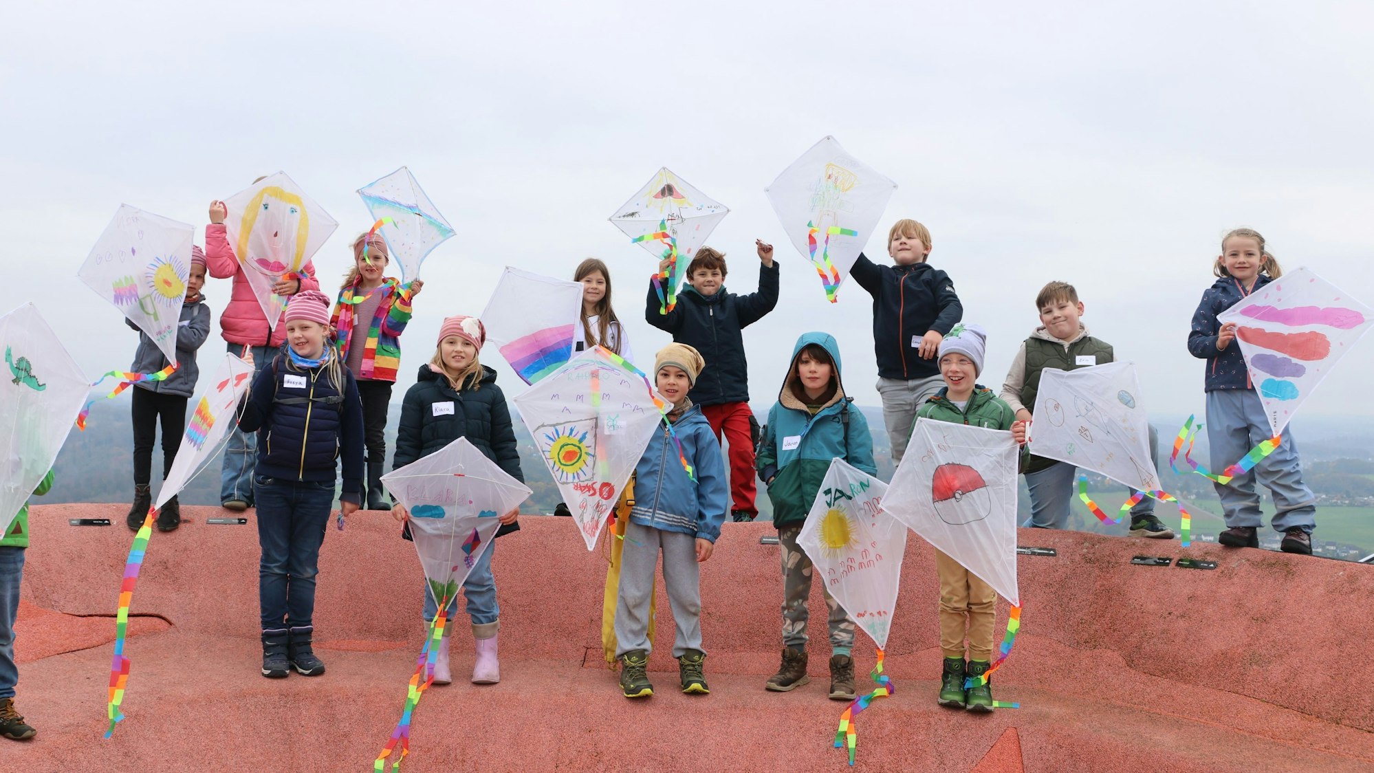 Auf der Aussichtsplattform von Metabolon zeigen die Kinder ihre neuen Drachen.