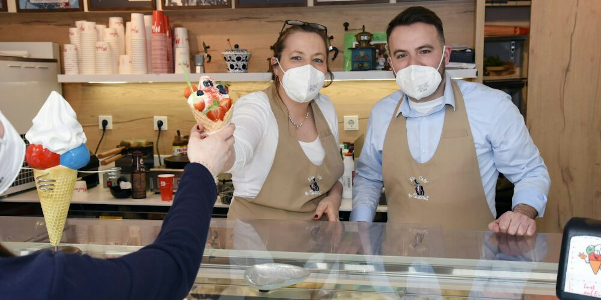 Für eine Eis-Erfrischung beim Einkaufsbummel sorgen Anita und Alessandro Martini.