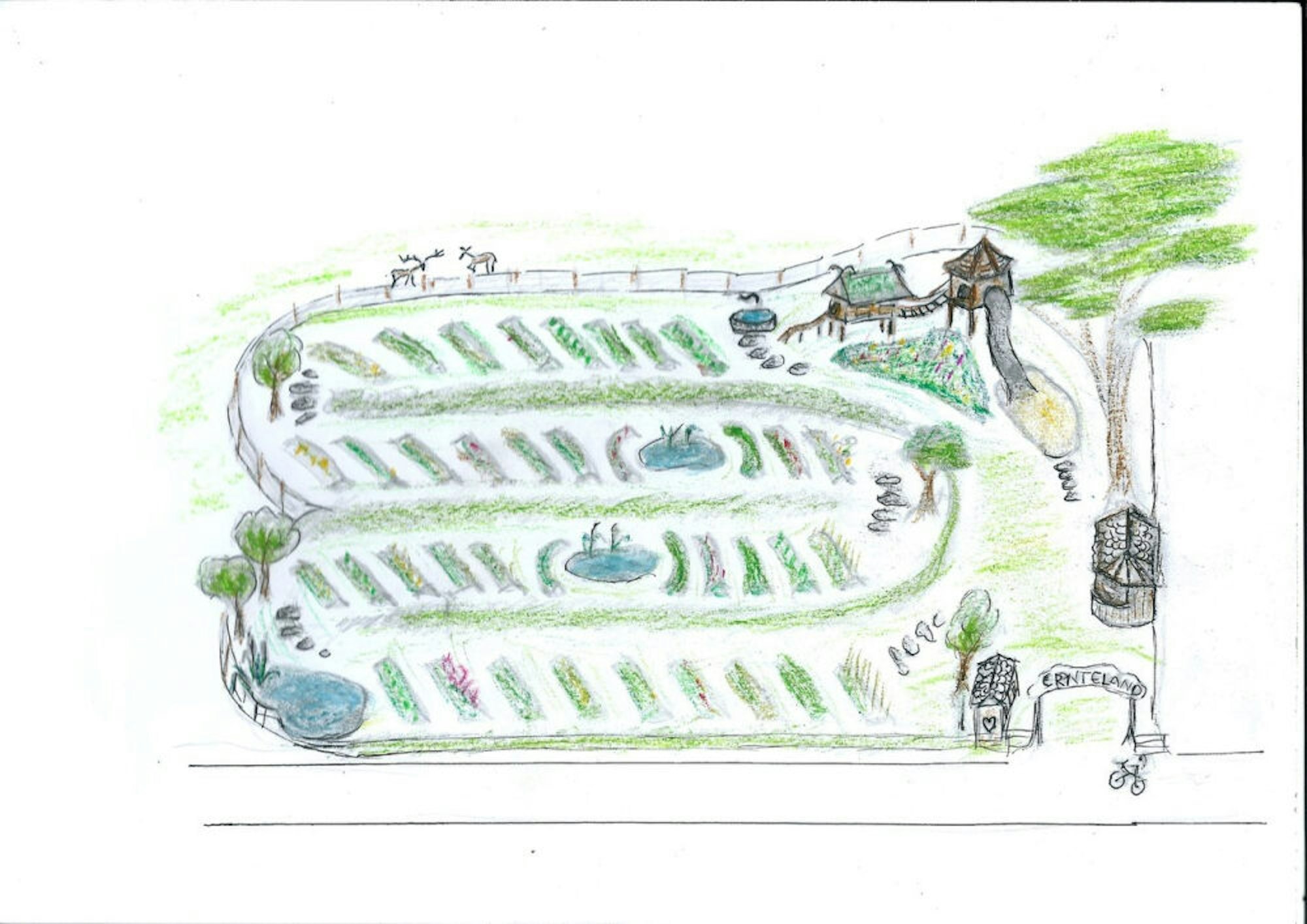 Die aktuellen Pläne für das Ernteland Marienheide lassen Großes erwarten. Auf dem gut 1500 Quadratmeter großen Gelände soll eine terrassierten Gartenanlage entstehen, in die zwei Spielhäuser integriert werden. Darunter gibt es ein Baumhaus auf Stelzen zum Thema Wiesenbewohner mit einem aus Moos und Farn begrünten Dach. Durch eine Hängebrücke wird das Baumhaus mit einem sogenannten Wabenhaus verbunden, in dessen Inneren themenbezogene Schaukästen über Bienen angebracht werden. Geplant ist außerdem eine Bienenwiese sowie der Bau eines Wildbienenhotels.