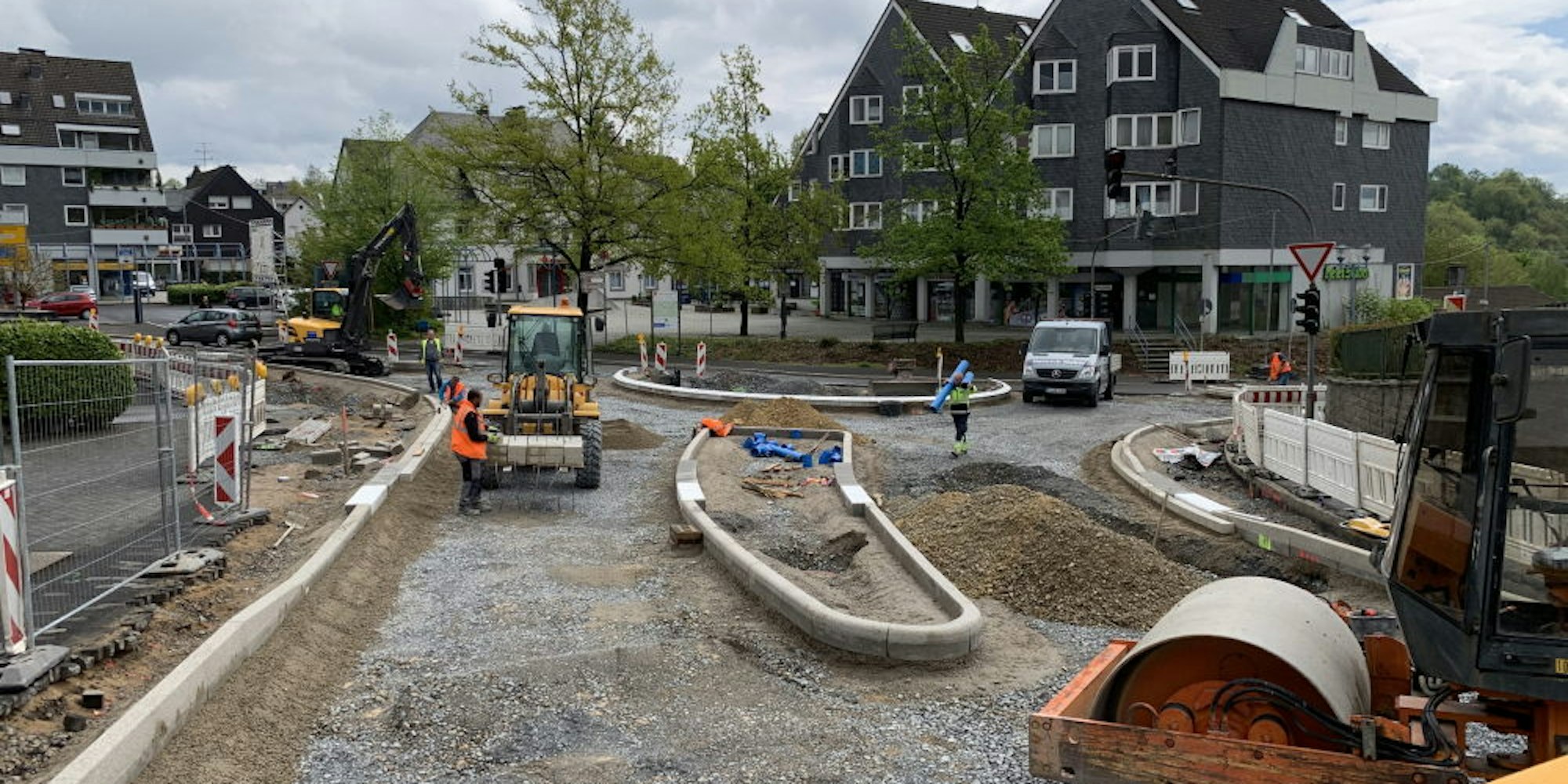 Marienheide – Am neuen Marienheide wird schon jetzt kräftig gebaut. In diesen Wochen entstehen auf der Leppestraße zwei Mini-Kreisverkehre, die Arbeiten kommen gut voran. Wer von der Scharder Straße auf die Baustelle blickt, hat einen guten Eindruck von der künftigen, runden Anmutung der bisherigen Ampel-Einmündung. Die Straßensanierung hat die Gemeinde jetzt in einen Ideenplan einfließen lassen. Er könnte die Richtung für eine Entwicklung des Ortszentrums vorgeben, die über die Maßnahmen des beschlossenen Integrierten Stadtentwicklungskonzepts (Isek) hinausgeht.