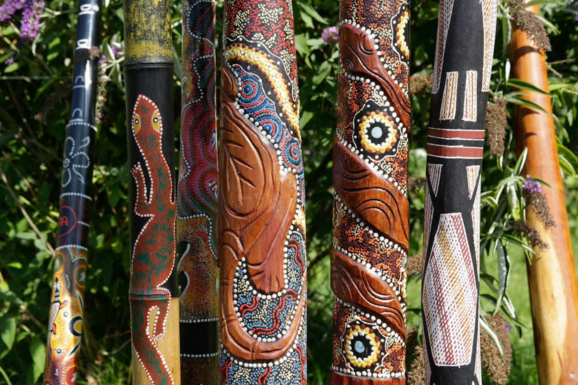Tief, sonor und erdig und dennoch ganz unterschiedlich klingen Friedrichs zehn „Didges“, wie die langen tönenden Röhren auch liebevoll genannt werden. Der Rolls Royce unter seinen Instrumenten ist das Didge aus Eukalyptus-Holz, das von dem Aborigine Norman Lane Ngartj in natürlichen Ockerfarben mit dem Design „Bush Potato Dreaming“ verziert wurde. Also frei übersetzt ist es mit „Busch-Kartoffel-Träumen“ bemalt, wobei mit „Bush Potato“ eine blühende australische Pflanze gemeint ist, deren Essenz stimmungsaufhellend wirken soll. Andere Instrumente sind aus Fiberglas, Birnenholz oder eben für Einsteiger aus leichtem Bambus. Doch wie Friedrich schmunzelnd erklärt: „Stimmungsaufhellend sind sie auf ihre Art alle – auch ohne Busch-Kartoffel-Bemalung.“