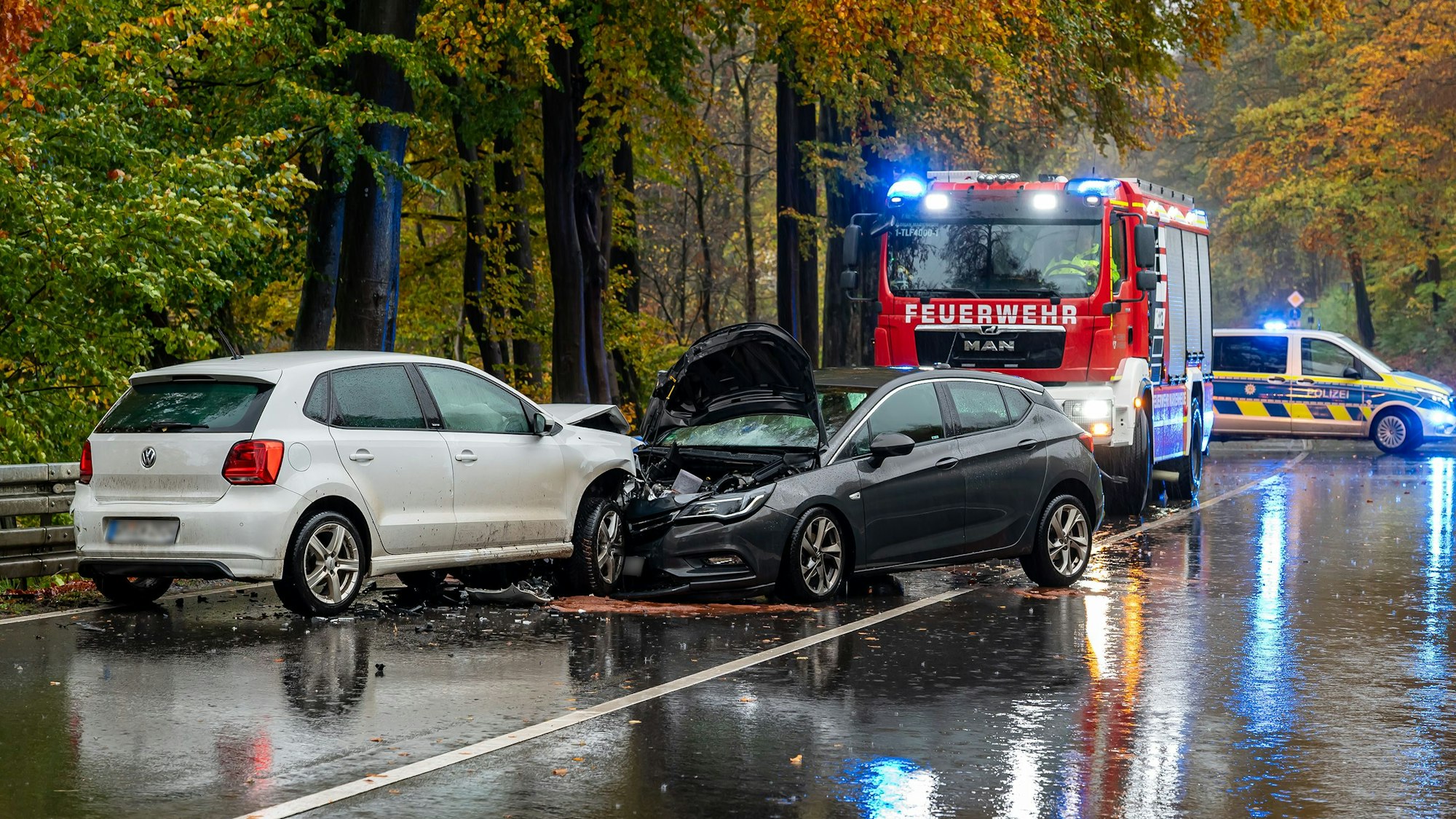 Drei LeichtverletzteZwei Autos kollidieren in Marienheide auf nasser Straße
