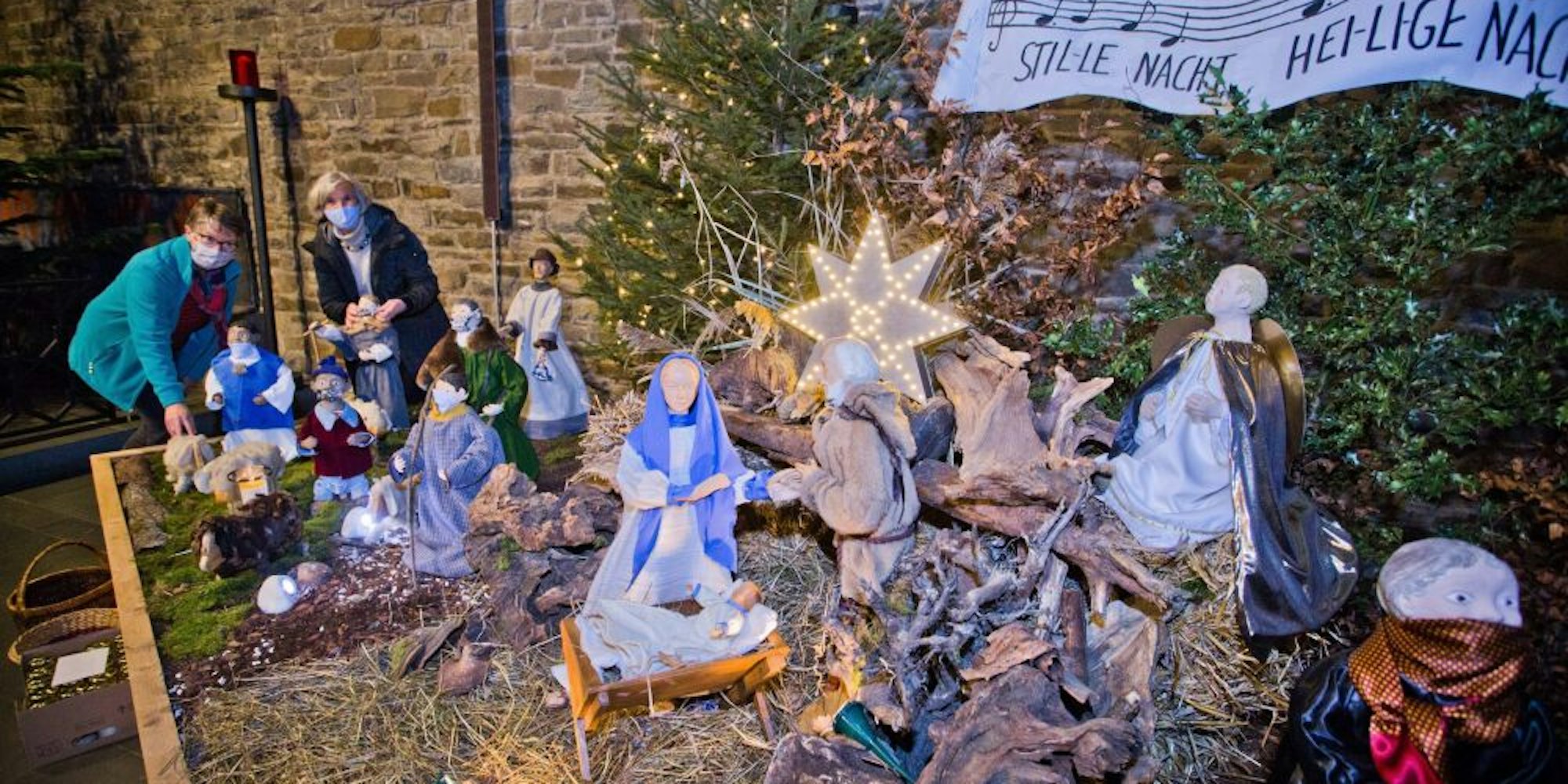 Neben dem Jesuskind hat sich nämlich auch in der Krippe ein singender Chor versammelt. „Wir wollen damit zeigen, dass wir als Gemeinschaft nach wie vor noch da sind“, erklärt Gisela Cremer. Gemeinsam mit Petra Lichtinghagen, Rita Schlütter, Kerstin Diederichs und Mia Feldhoff gehört sie zum festen Krippen-Team. Jeweils an den Adventssonntagen haben sie verschiedene Bilder aufgebaut – bis hin zur Geburt Jesu Christi als Höhepunkt der wechselnden Krippenszenen.