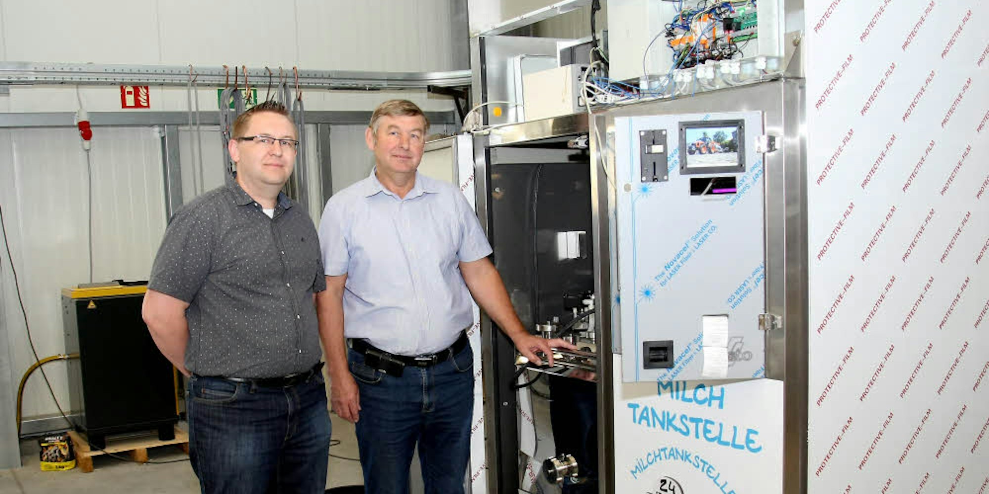 Die neueste Generation der Milchtankstelle, die Seniorchef Jakob Risto und Juniorchef Klaus Risto zeigen, kann per App bedient werden.