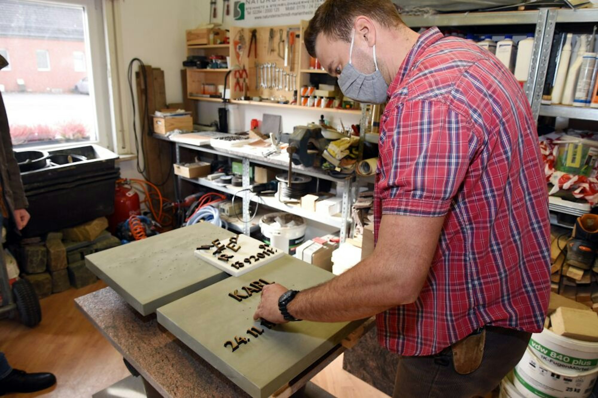 In seiner Werkstatt in Marienheide arbeitet Schmidt an diesem Vormittag an zwei hellgrauen Platten. Buchstaben und Ziffern aus Bronze liegen darauf verteilt. Per Schablone hat der 36-Jährige die Position ihrer Haltestifte auf die Platte übertragen und Löcher in den Stein gebohrt. So wird die Schrift in der Platte verankert. Er arbeitet genau, jeder Millimeter zählt. Denn Schmidt ist sich bewusst: Die von ihm geschaffenen Gedenksteine symbolisieren ein ganzes Leben.