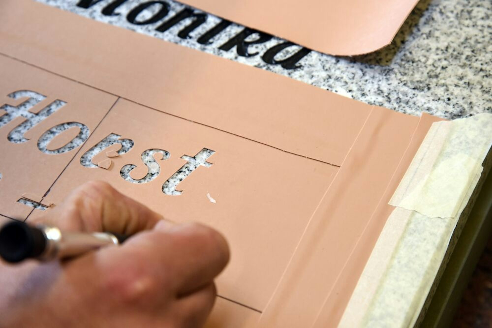 Per Schablone werden die Haltestifte auf die Platte übertragen und Löcher in den Stein gebohrt. So wird die Schrift in der Platte verankert.