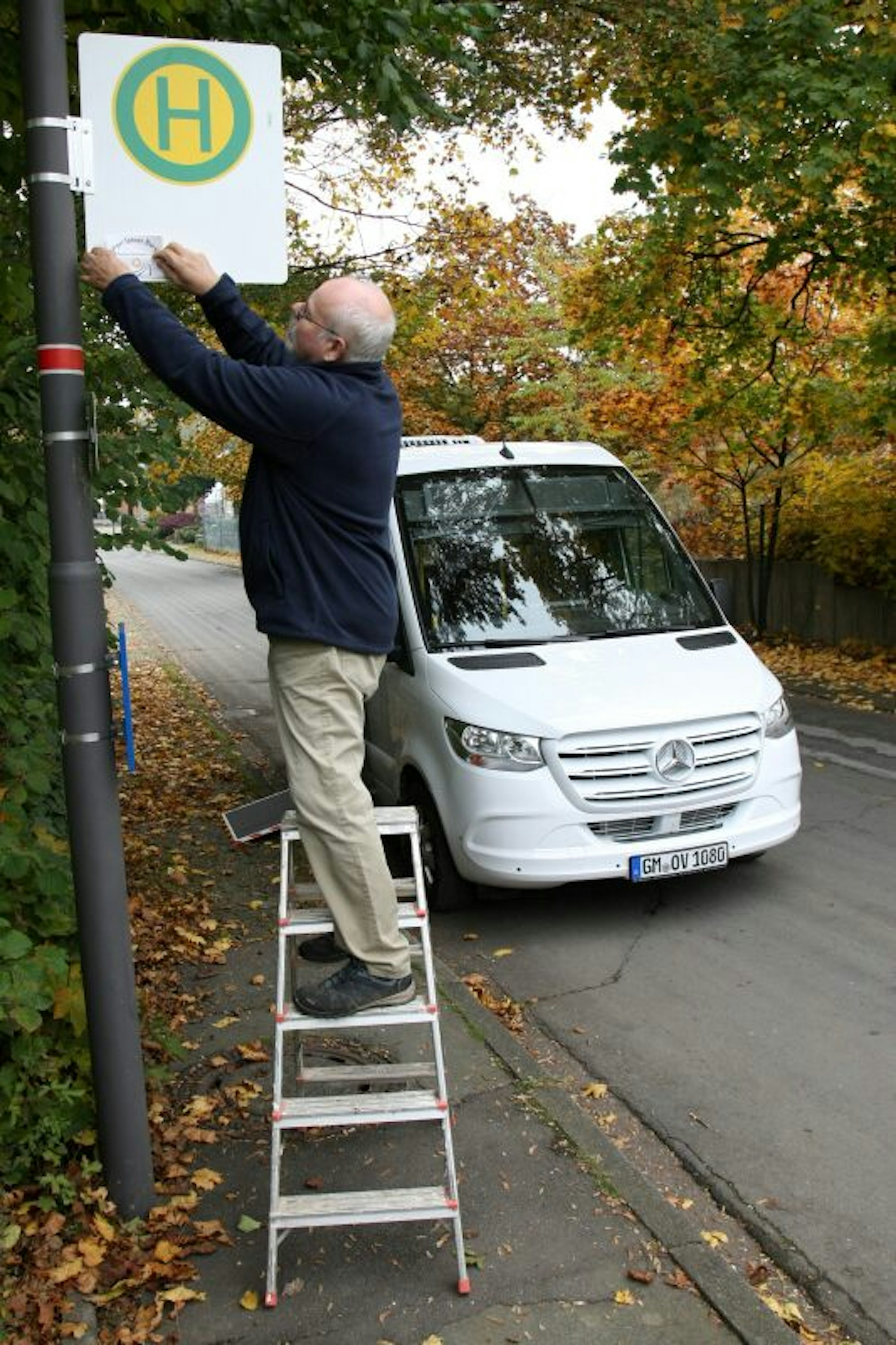 Der Vize-Chef des Bürgerbusvereins, Klaus Schellpeper, hat sich an diesem Vormittag hinters Steuer gesetzt, um ein paar der künftigen Haltestellen abzuklappern. Nachdem bereits im vergangenen Monat entlang der vier Routen ein paar Dutzend Schilder mit dem „H“ installiert wurden, steigt Schellpeper am Haltepunkt an der Ostlandstraße in Rodt auf die Leiter und pappt einen Vereinsaufkleber an das Schild.