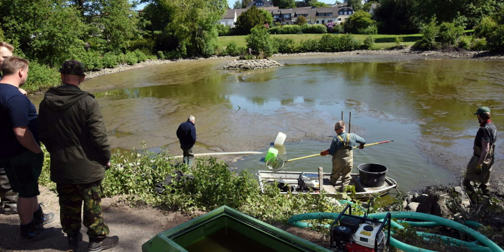 Nachdem in einem ersten Schritt schon jede Menge Fische von Rose und Kollegen aus dem Wasser geholt wurden, haben Mitarbeiter des Aggerverbands mit dem Abpumpen begonnen. Über eine Zahnradpumpe, die bis zu 60 Liter pro Sekunde fördert, wird das Wasser in einem Schlauch zum Ablass geführt. Von dort plätschert es durch den Damm in Richtung Leppe. Am Donnerstag ist aus dem 4300 Quadratmeter großen See mit seinem Fassungsvermögen von rund 4500 Kubikmetern bereits das meiste Wasser verschwunden. In den verbleibenden Lachen haben es die Fischer nun einfacher, die restlichen Tiere einzufangen. Knapp 50 Karpfen, tausend Giebel und hunderte Rotaugen, Moderlieschen, Grundlinge und auch ein paar Goldfische wandern nach und nach in große, mit Sauerstoff versorgte Tanks auf Anhängern. Sie werden in Richtung Bielefeld gebracht. Heimische Fischarten, erklärt Rose, erhalten ein neues Zuhause in einem Gewässer. Nicht-heimische Fische wie der Giebel und Goldfisch, so ist es vorgeschrieben, dürfen nicht wieder ausgesetzt werden – sie kommen als Futter in einen Tierpark. Keine ursprünglichen Bewohner sind auch die amerikanischen Signalkrebse, die auf unbekannte Weise in den Heilteich gelangt sind. Eine ganze Kiste der invasiven Edelkrebse haben die Fischer eingesammelt.