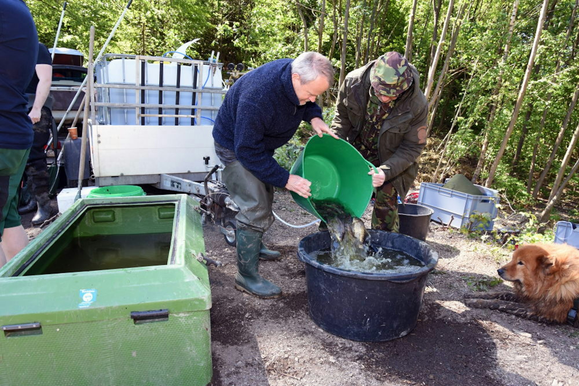 Um im ersten Schritt der Sanierung die Teichanlage auf Vordermann bringen zu können, haben die Gemeindeverwaltung und das Ingenieurbüro Donner und Marenbach den Fischereisachverständigen Jonas Rose ins Boot geholt. Der ist erstmals am Freitag in der vergangenen Woche von seiner Heimat im niedersächsischen Melle nach Marienheide gekommen, gemeinsam mit zwei Bekannten des Sportfischereivereins Bielefeld. Die Experten wurden beauftragt, die Fische aus dem künstlichen Gewässer zu holen. Die Karpfen haben dort jahrzehntelang ungestört ihre Bahnen gezogen.