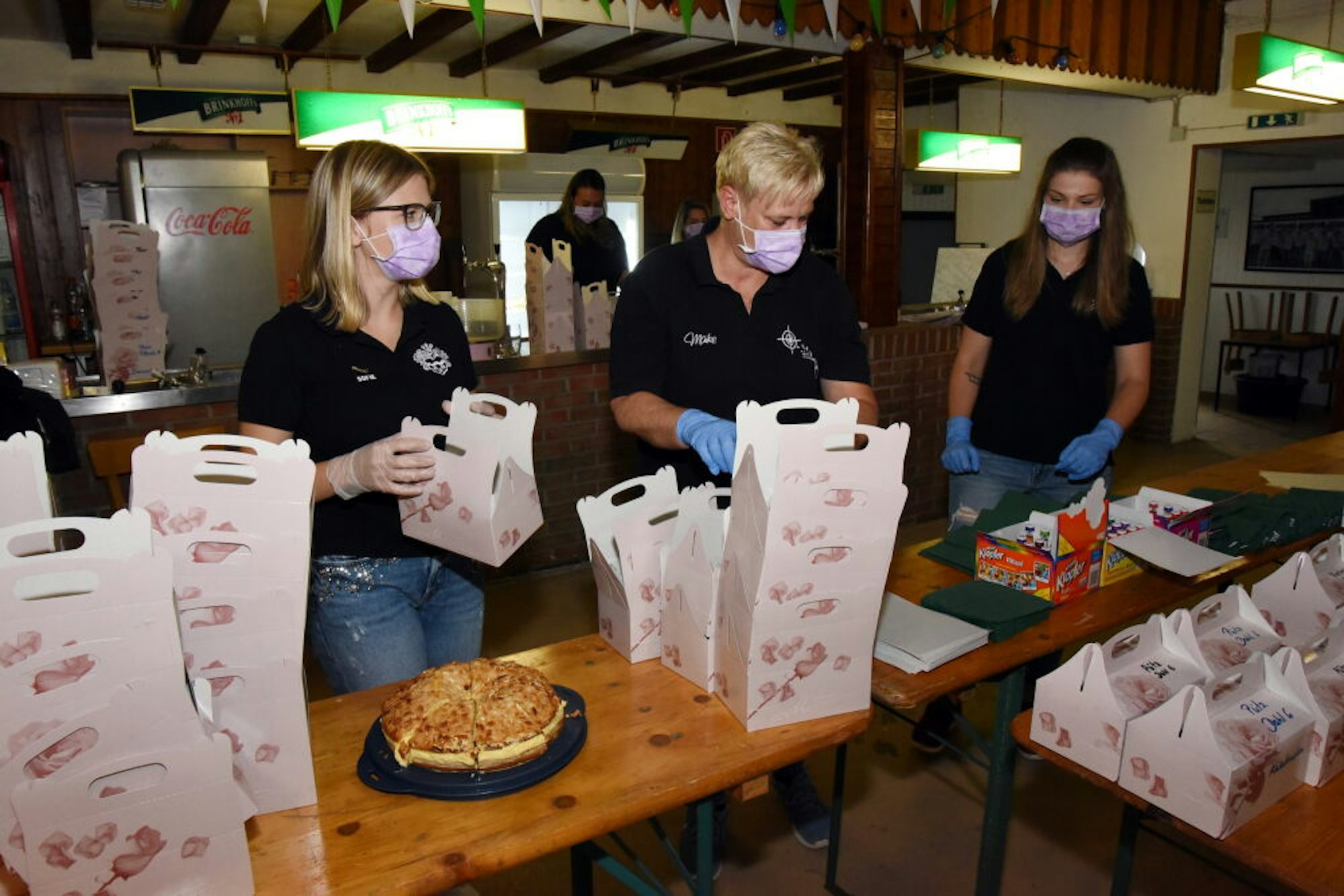 Am Samstagabend beginnt das Schützenfest eigentlich mit dem Platzkonzert, ehe die Schützen zur Kranzniederlegung zum Friedhof marschieren und anschließend der Festkommers stattfindet. Dieses Mal wurde der Kranz schon am Morgen niedergelegt. Dann ging es zwar in die Schützenhalle, doch dort wurde nicht gefeiert, sondern Kuchen verpackt.