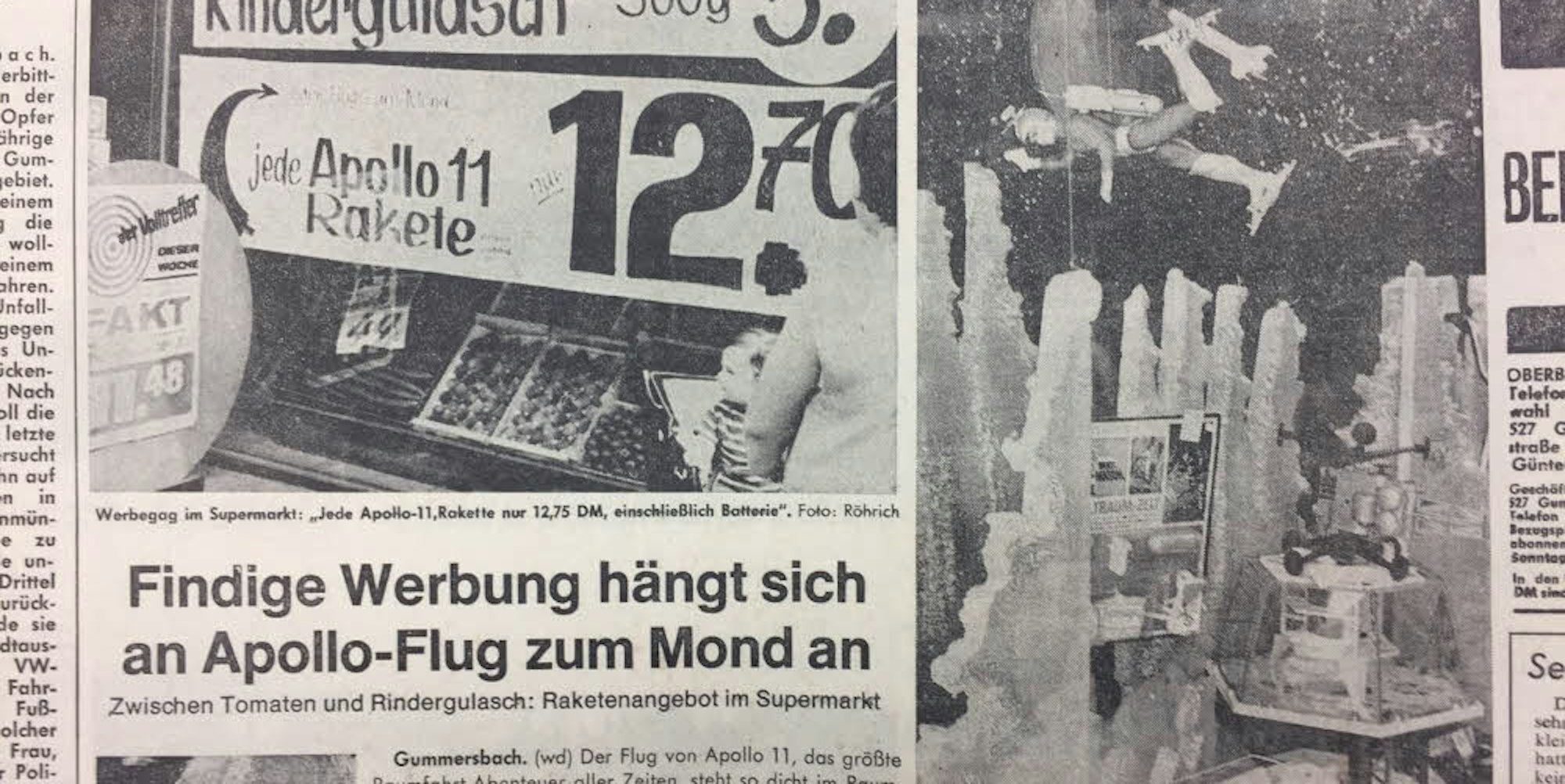 Noch größer als die Werbung für Rindergulasch (500 Gramm für 3,20 D-Mark) pries ein Supermarkt für den Flug zum Mond Apollo-11-Raketen an – für 12,70 D-Mark, Batterie inklusive. Ob auch Mondamin im Angebot war, ist nicht überliefert.