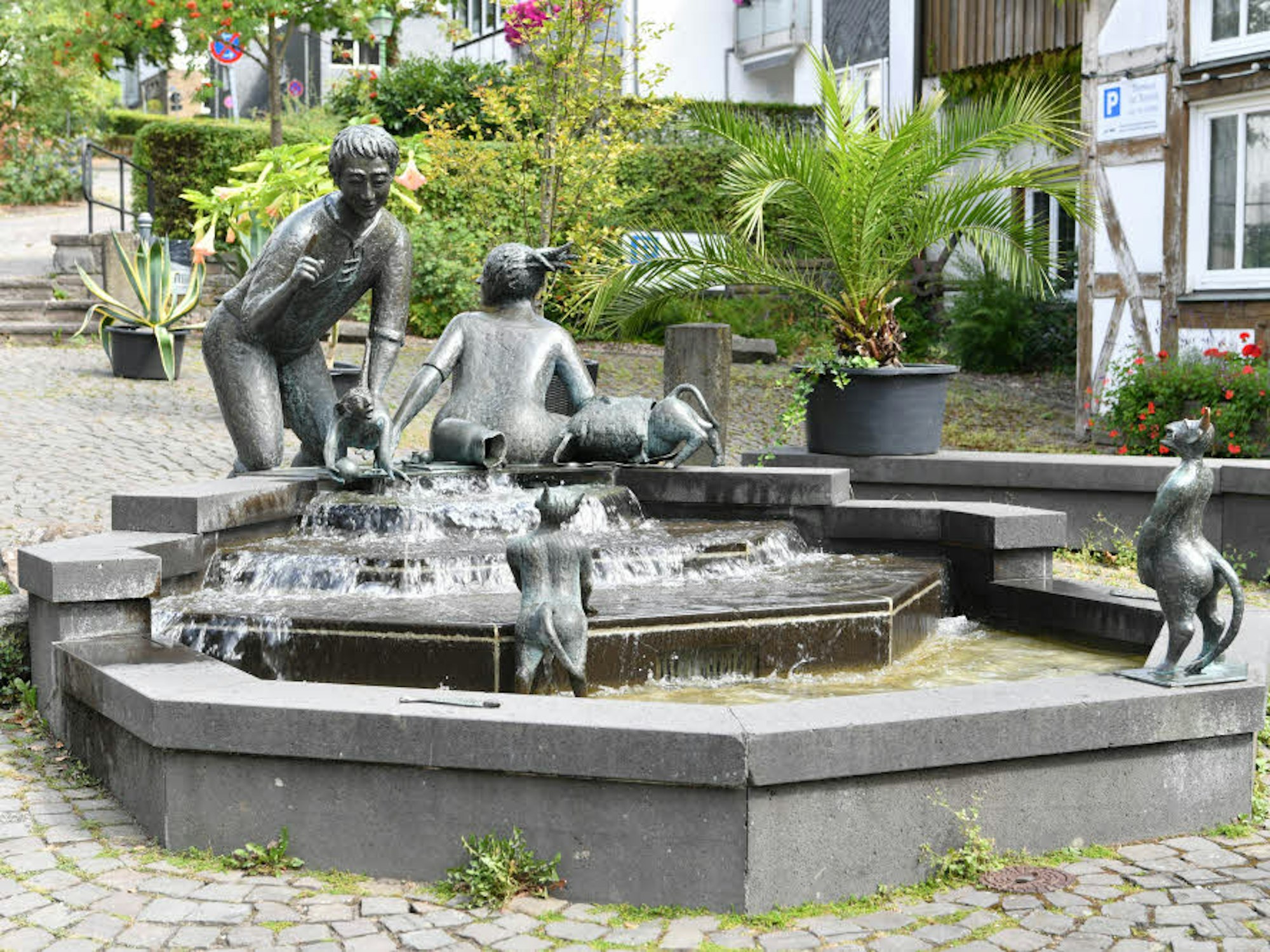Vor allem die Details am Brunnen lassen den Betrachter schmunzeln: Vor dem Wasserspiel liegen Münzen auf dem Pflaster. Doch will man sie aufheben, bleiben sie am Boden kleben. Auf einem Stein daneben hockt ein skurriles Wesen mit Fotoapparat und einer zusammengerollten Skizze unter dem Arm. Ist es vielleicht der Künstler, der die Bronzefiguren 1991 erschaffen und sich selbst verewigt hat?