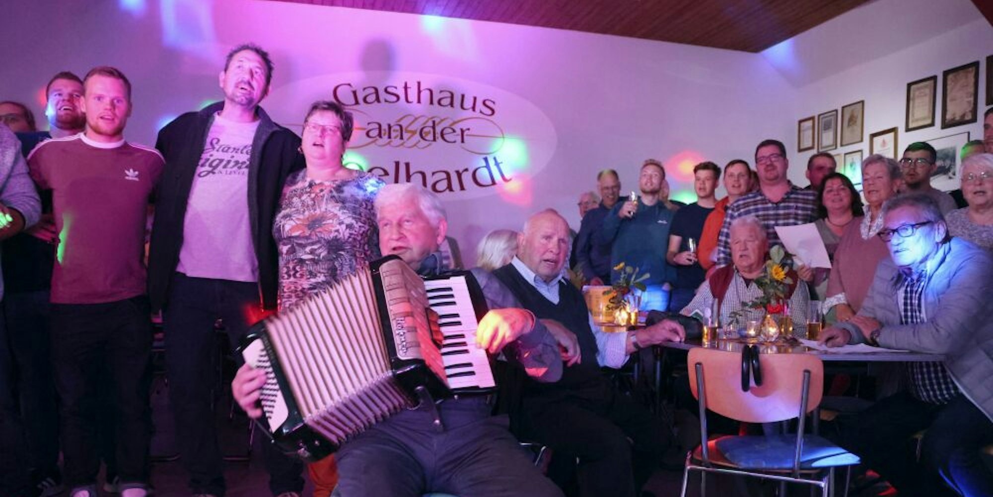 Der Männergesangverein „Eintracht“ Morsbach hat am Samstag Abschied von seinem Probenlokal genommen. Im „Gasthaus an der Seelhardt“ hat der Chor seit der Gründung 1913 geprobt. Eingeladen waren der Frauenchor „Cantabile“ und der Morsbacher Singkreis, die ebenfalls in den historischen Räumen proben, sowie alle, die sich von „Morsbachs guter Stube“ verabschieden wollten. Extra aus Wissen etwa war Stefan Quast (83) gekommen, der – nach 42 Jahren als aktiver Sänger bis 2017 – die Gaststätte noch einmal sehen wollte. „Lasset die Spiele beginnen“, sagte Vizevorsitzender Frank Rinscheid zum Auftakt der Veranstaltung, die am Nachmittag mit Kaffee und Kuchen begann und am Abend mit Kevin „Erwin“ Schneider am Keyboard und der Sängerin Verena Fuhr fortgeführt wurde.