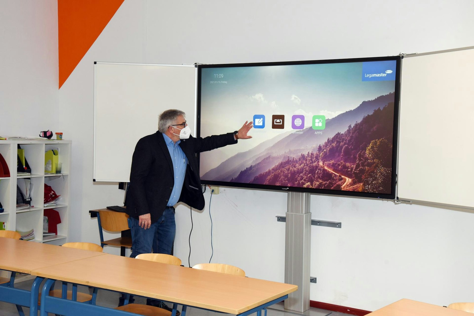 Schulleiter Jürgen Greis führt die interaktiven Tafeln vor
