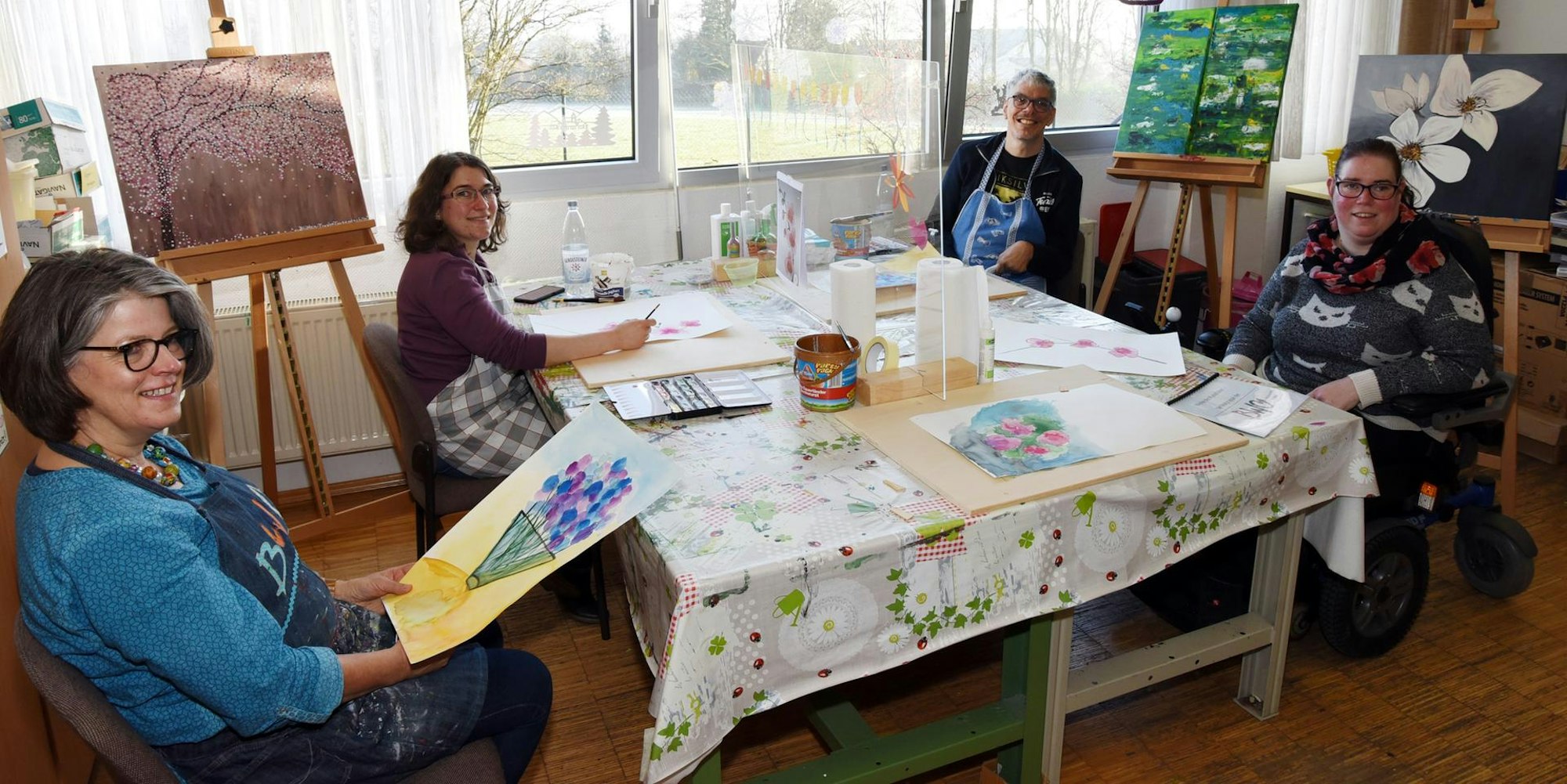 Die Gruppe Kunstfalter um Leiterin Jutta Schneider (l.) in ihrem Atelier