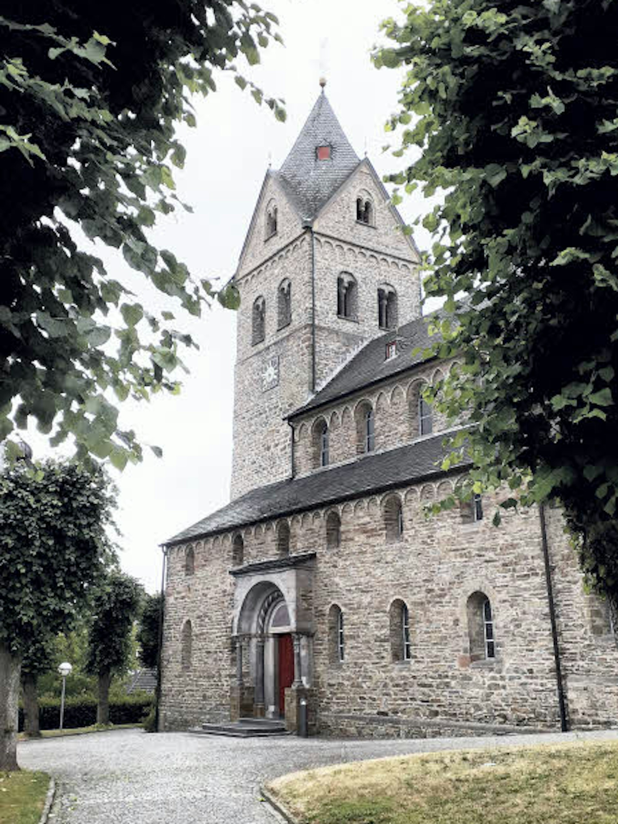 Die Morsbacher Basilika St. Gertrud wird von Linden gesäumt.