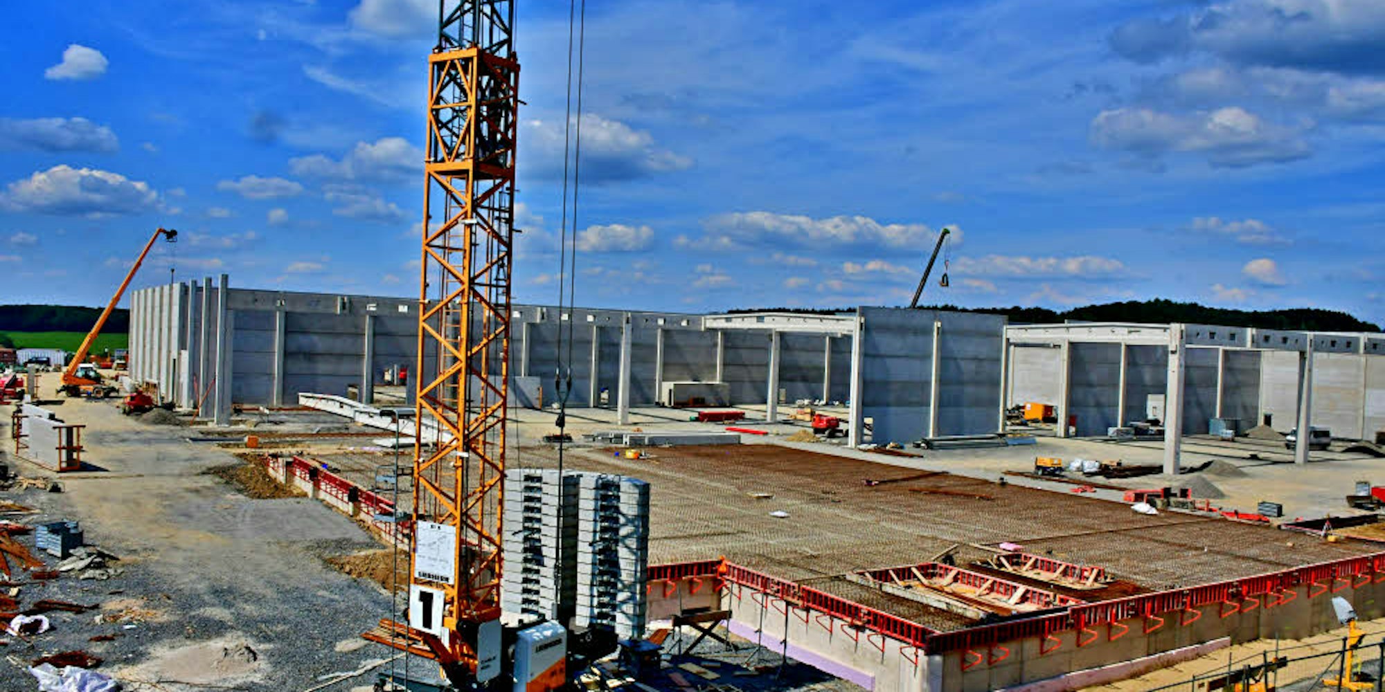 Das ist erst der Anfang: Fünf der neun Hallen des neuen Montaplast-Standorts in Lichtenberg sollen im Juli fertig sein.