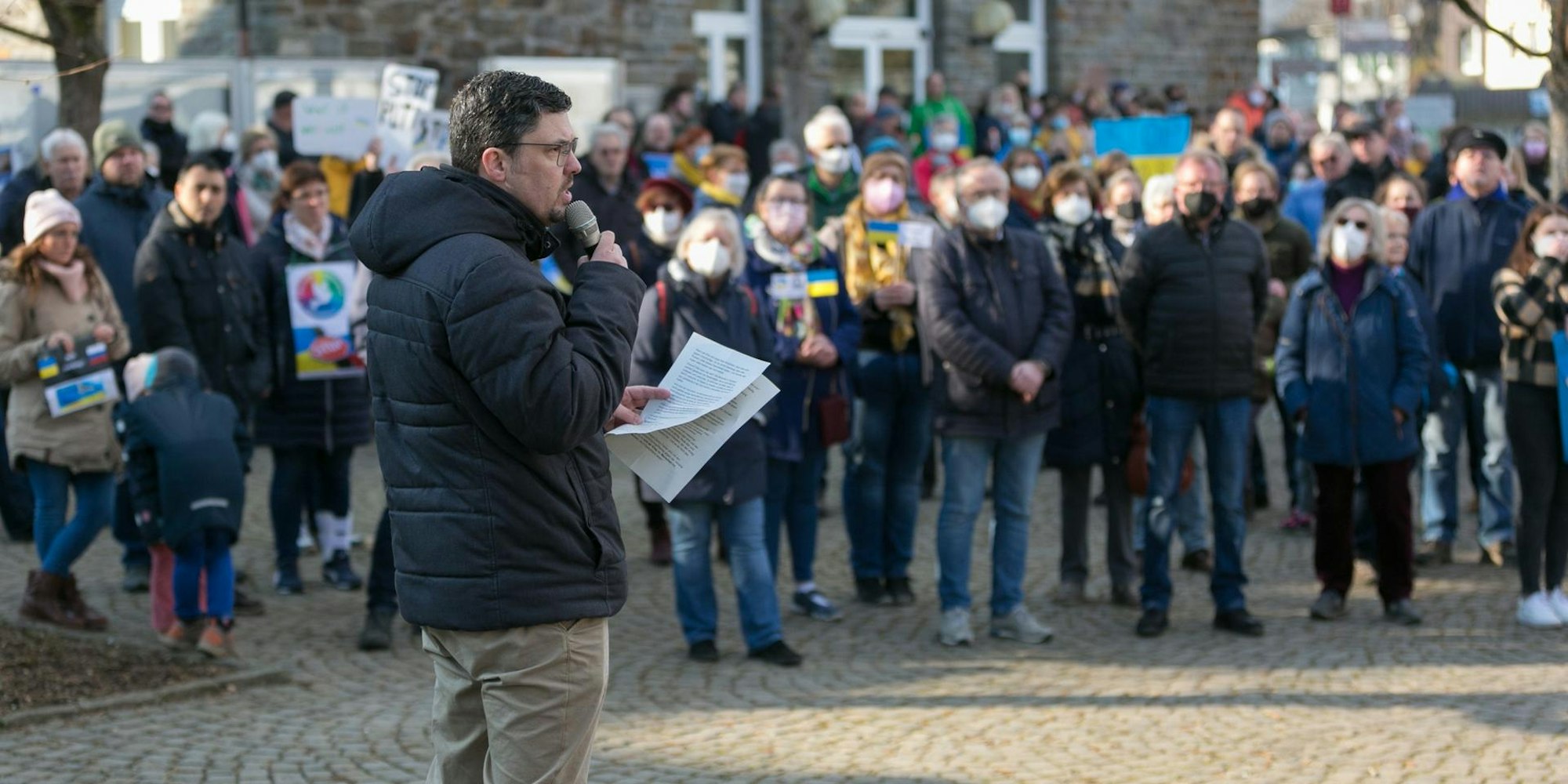 Der evangelische Posaunenchor Holpe-Hermesdorf stimmte mit Chorälen darauf ein, bevor die Gemeindereferenten Jan Weber und Karin Thomas Gebete, Psalmen und Impulse für den Frieden vortrugen. Auf dem Milly-la-Forêt-Platz am Rathaus erwartete Bürgermeister Jörg Bukowski den Marsch. Über ihm wehten die Europafahne, die Fahne der Ukraine und die blaue Friedensfahne, an den Fenstern des Rathauses klebten weiße Silhouetten von Tauben. „Mit diesem Friedensmarsch senden wir Signale aus“, sagte Bukowski, „Wir stehen zusammen! Wir sind gegen Krieg in der Ukraine, aber auch sonst auf dieser Erde!“ Zudem zählt Bukowski die zahlreichen Kriege und bewaffneten Konflikte auf, die in den vergangenen Jahren auf der Welt geführt wurden. „Mir ist wichtig, klar und deutlich zu sagen: Es ist der russische Präsident, der den Krieg in der gesamten Ukraine ausgelöst hat – und es ist nicht das gesamte russische Volk.“