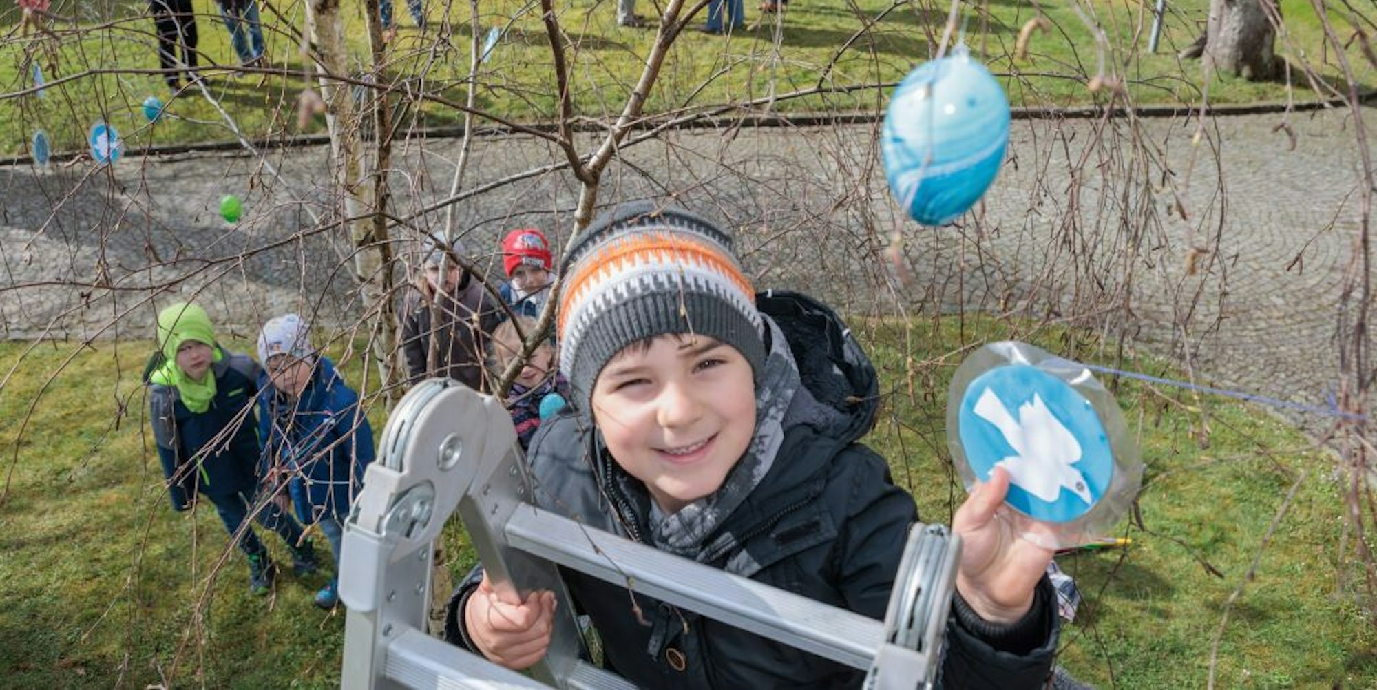 Morsbach – „Das eine ist ganz verdreht!“, ertönt eine Kinderstimme. Tatsächlich flattern die bunten Ostereier und Friedenssymbole fröhlich in den Ästen der Birke, die auf dem Kirchplatz vor der Basilika St. Gertrud in Morsbach steht – das bunte Chaos tut aber weder der Ästhetik noch der Botschaft des Friedensbaums Abbruch.