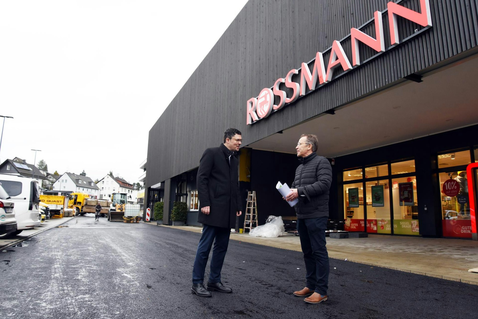 Elf Mitarbeiterinnen und Mitarbeiter werden hier beschäftigt sein, darunter sieben Neueinstellungen, wie Rossmann mitteilt. Draußen werden derweil noch Verkleidungen an die Fassade geschraubt. Die Tiefbauleute verlegen auf dem Parkplatz die letzten Pflastersteine. Reinhard Hombach vertritt den Bauherrn Holma-Immobilien, eine Tochter der Friesenhagener Systembaufirma Alho. Beim Treffen auf der Baustelle ist er sich einig mit Morsbachs Bürgermeister Jörg Bukowski, dass das neue Fachmarktzentrum eine städtebauliche Bereicherung für Morsbach ist. Das Bauprojekt füge sich gut ein in die parallele Umgestaltung des Ortes an der Bachstraße und am Bahnhof. Hombach ist zufrieden, wie sich die Straße an dieser Stelle weitet und das Ortszentrum öffnet, und weist darauf hin, dass die neue Holzfassade den grundsanierten Altbau an den Neubau des Nettomarkts optisch anbindet.
