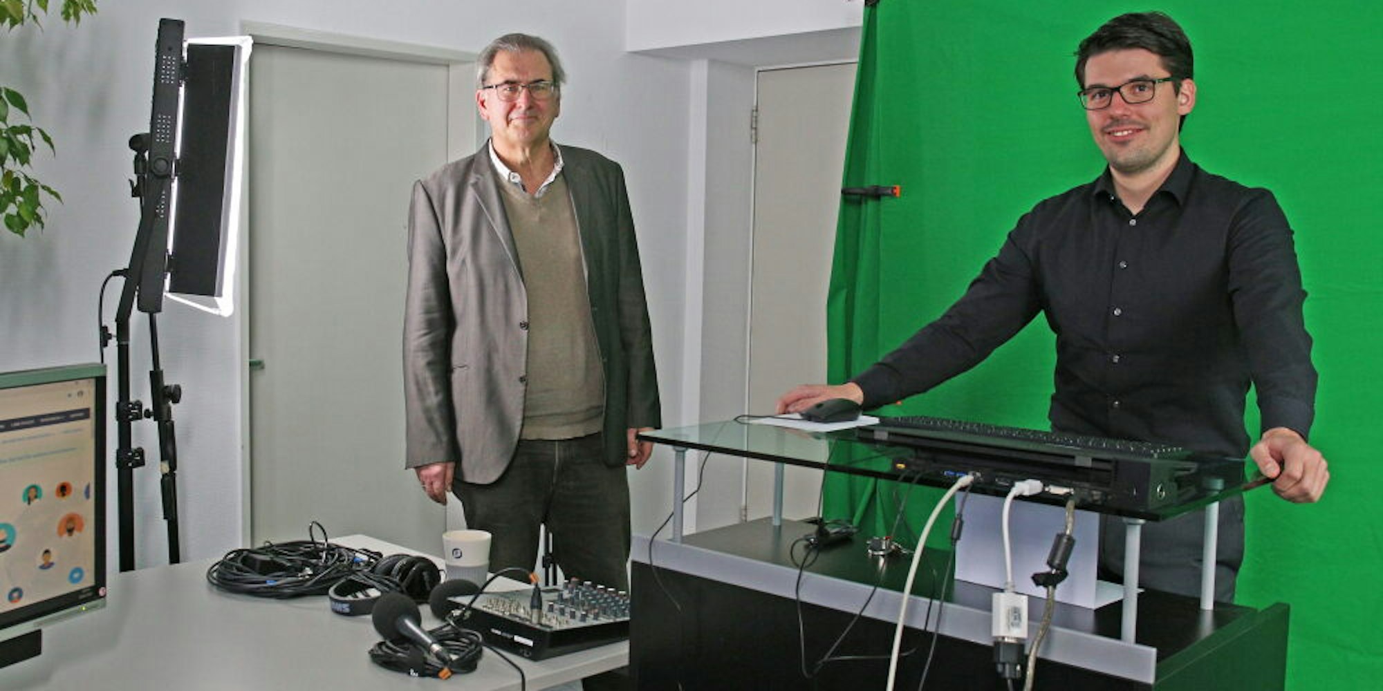 Akademie-Leiter Klaus Füßmann (l.) mit Referent Martin Thoma im Internetstudio der Akademie.