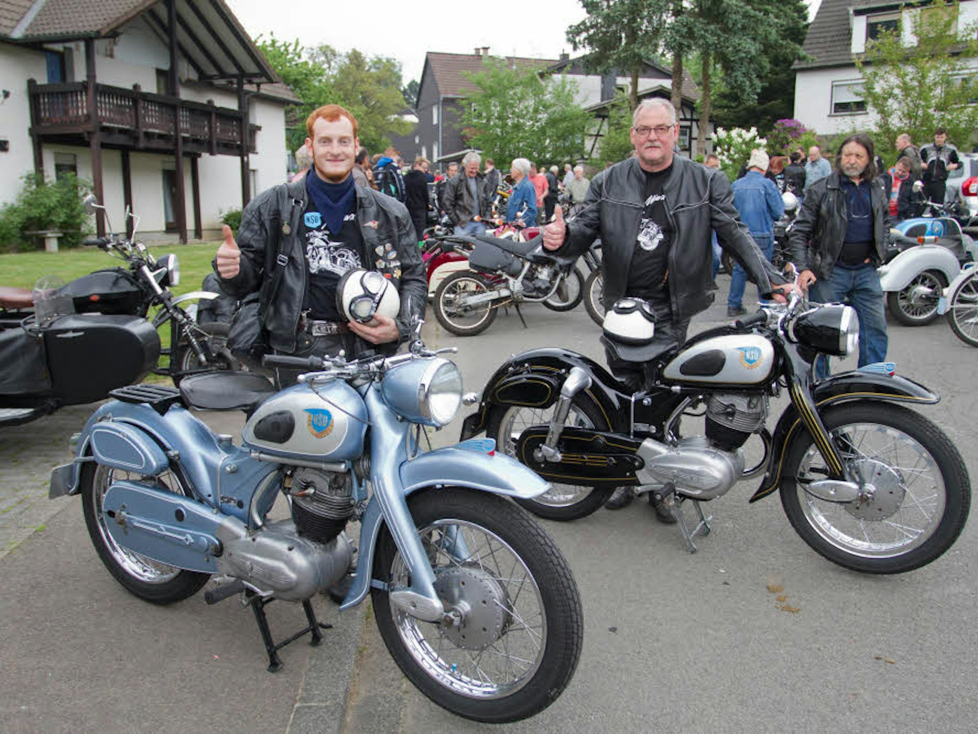 Karl-Wilfried Klein und sein Sohn Matthias sind aus Reichshof-Denklingen angereist. Ganz ohne Zeitdruck stehen sie neben ihren NSU Max Spezial, Baujahr 1954 und 1955, eine mit 17 und die andere mit 18 PS. „Wir sind in ganz Deutschland auf Oldtimer-Treffen unterwegs“, erklärt Karl-Wilfried Klein.