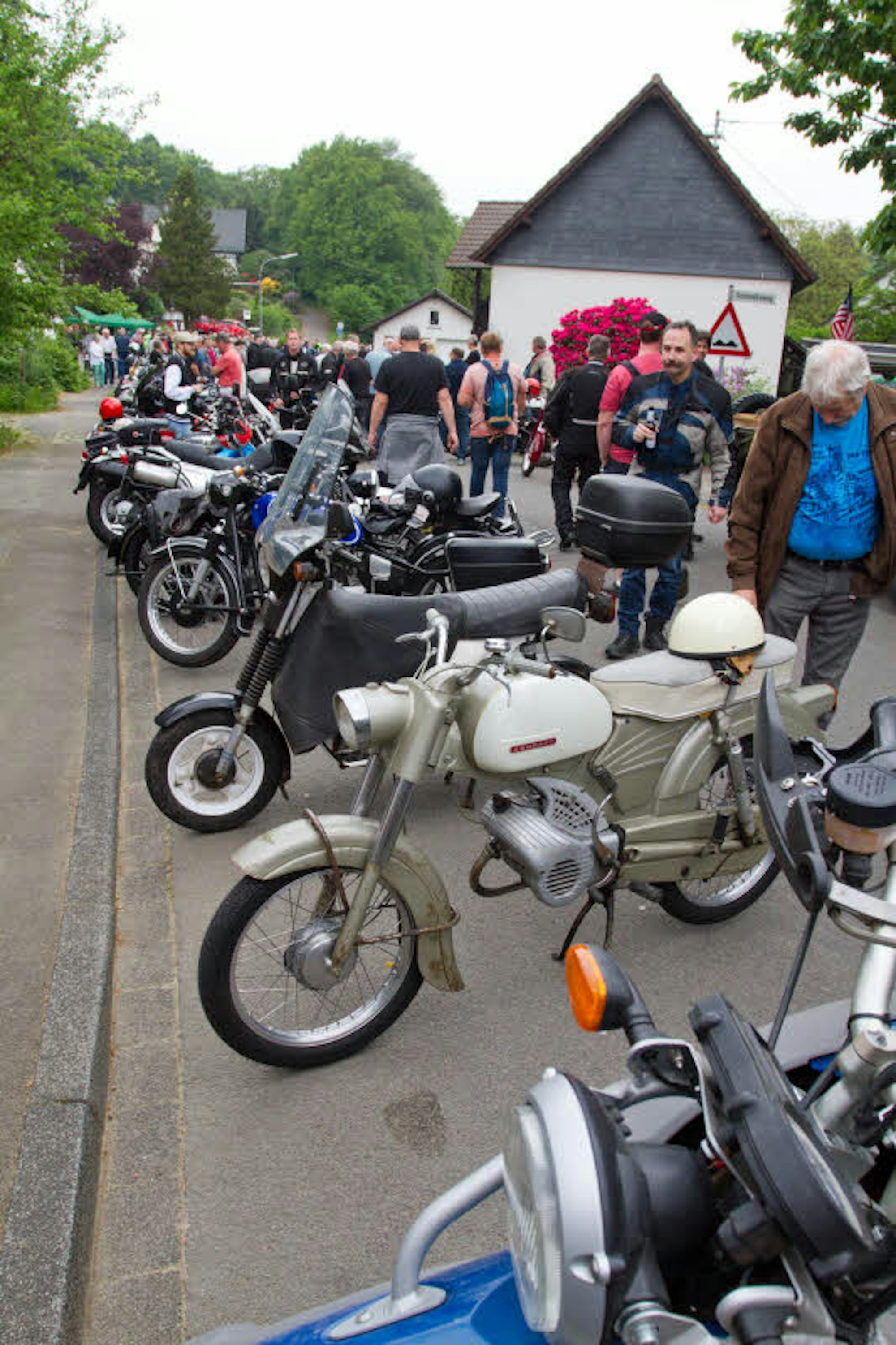Prombach – Seit 17 Jahren tut sich am Vatertag in Nümbrecht-Prombach Seltsames: Von allen Seiten fahren an diesem Himmelfahrtstag Zweiräder in das beschauliche Örtchen. Auch in diesem Jahr lud der Gemeinnützige Verein Prombach wieder zum Motorrad-Oldtimer-Treffen ein. Und obwohl sich die Ausrichter mit Werbung sehr zurückhalten, kamen wieder fast 150 Fahrer mit ihren alten Schätzchen – dabei handelte es sich oftmals um alte Bekannte dieser Veranstaltung, wie Vereinsvorsitzender Henry Daub erklärt.