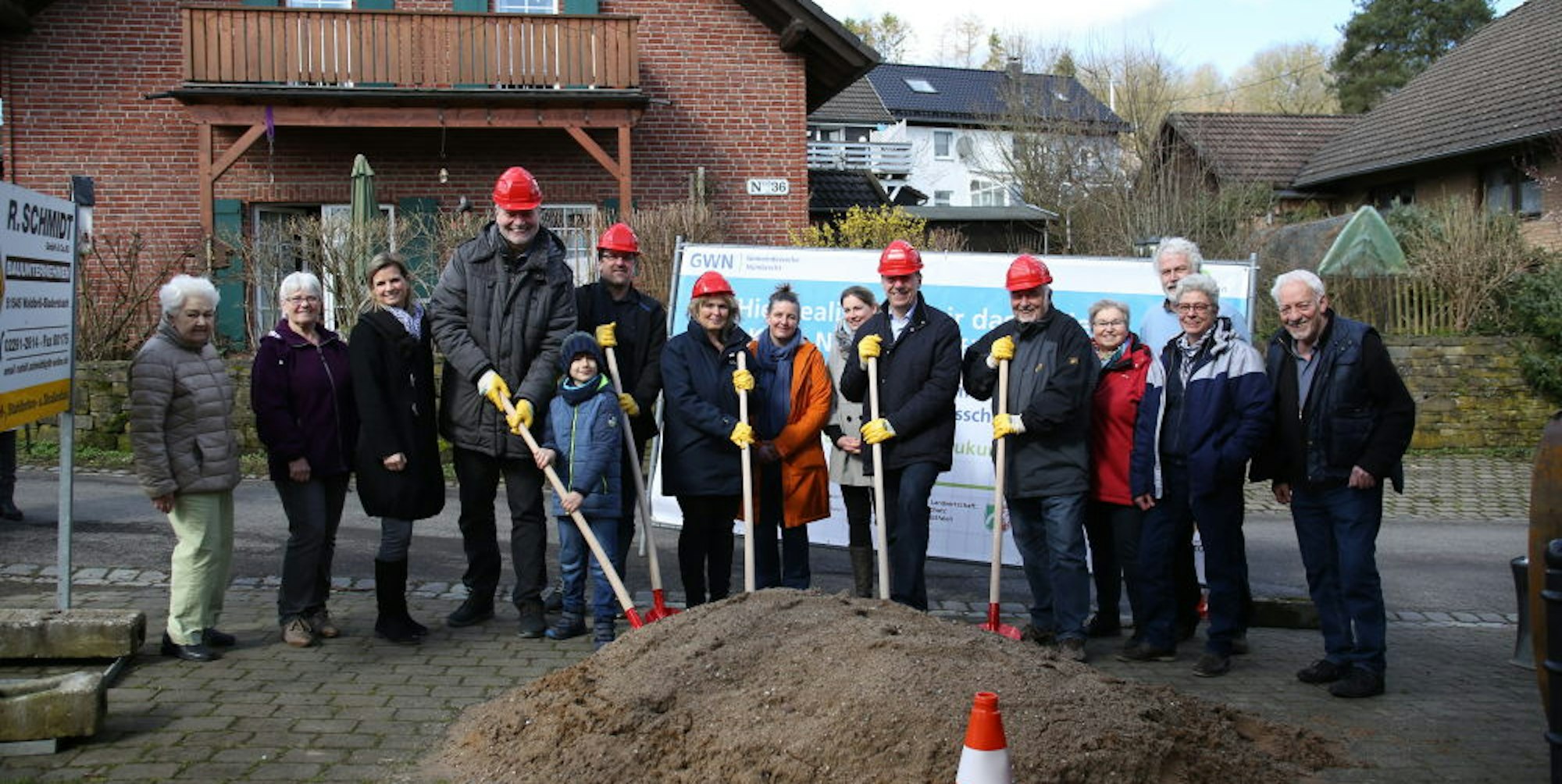 Benroth – Wenn die Nümbrechter Gemeindewerke (GWN) in Benroth den großen Aufriss beginnen, dann bringen die Arbeiter in dem Nümbrechter Ort nicht nur das schnelle Breitbandinternet unter die Erde, sondern verlegen auch eine 1,1 Kilometer lange Ringleitung. Vorerst zehn Benrother Häuser werden künftig über ein Nahwärmenetz mit ausschließlich regenerativer Energie versorgt. Damit das ein bisschen schneller geht, haben nicht nur die beiden GWN-Geschäftsführer Karina Tuttlies und Stefan Muth den Spaten in die Hand genommen. Oberbergs Landrat Jochen Hagt und Nümbrechts Bürgermeister Hilko Redenius mussten am Dorfhaus ebenfalls mitschaufeln – symbolisch, zumindest.