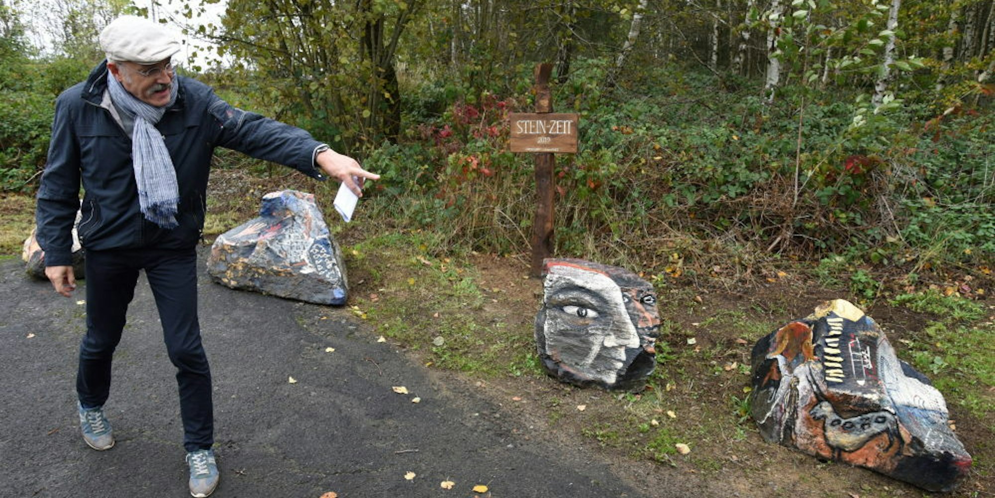 Besonders begeistert habe ihn die Darstellung eines Höhlenlöwen aus der französischen Chauvet-Höhle: „Diese ist 30 000 Jahre alt und von vollendeter Schönheit.“ Auf dem kleinen Platz steht ein archaisch anmutender Eichenbalken aus einer alten Scheune mit einer Tafel und der Aufschrift „Stein-Zeit“. Dieser harmoniert mit der Installation. Für das Frühjahr ist eine Pflanzung von Heckenrosen am Steinhalbkreis geplant.