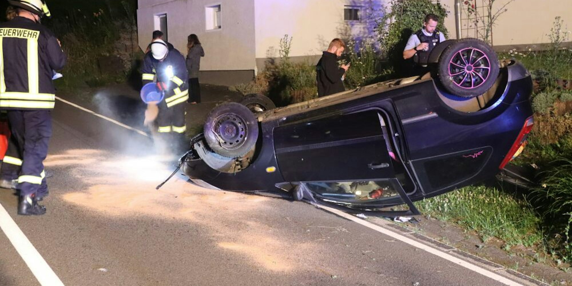 Beim Versuch, gegenzulenken, geriet der Ford Fiesta dann auf die linke Fahrbahnseite und kollidierte dort mit einer Bruchsteinmauer. Das Auto drehte und überschlug sich und blieb schließlich auf dem Dach liegen.
