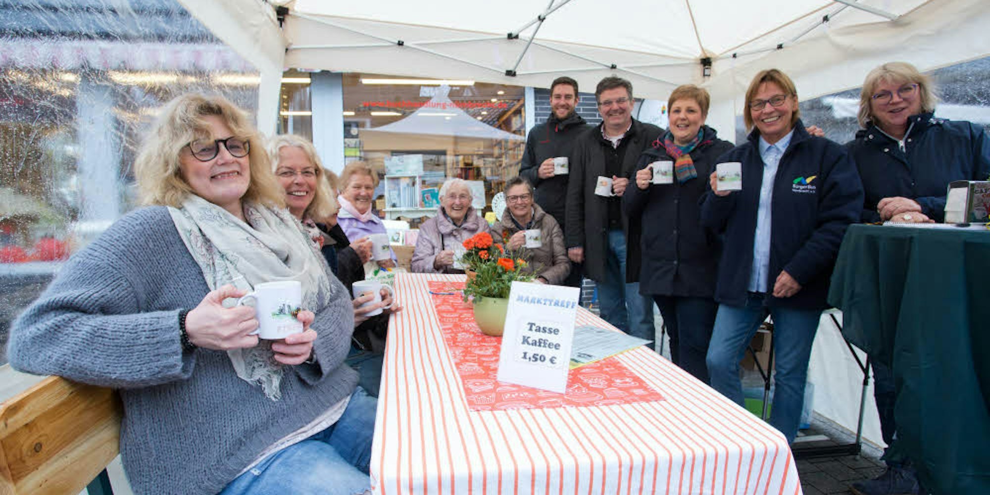 Heißer Kaffee bei tristem Regenwetter: Zahlreiche Nümbrechter nutzten den ersten „Markt-Treff“, um sich aufzuwärmen.