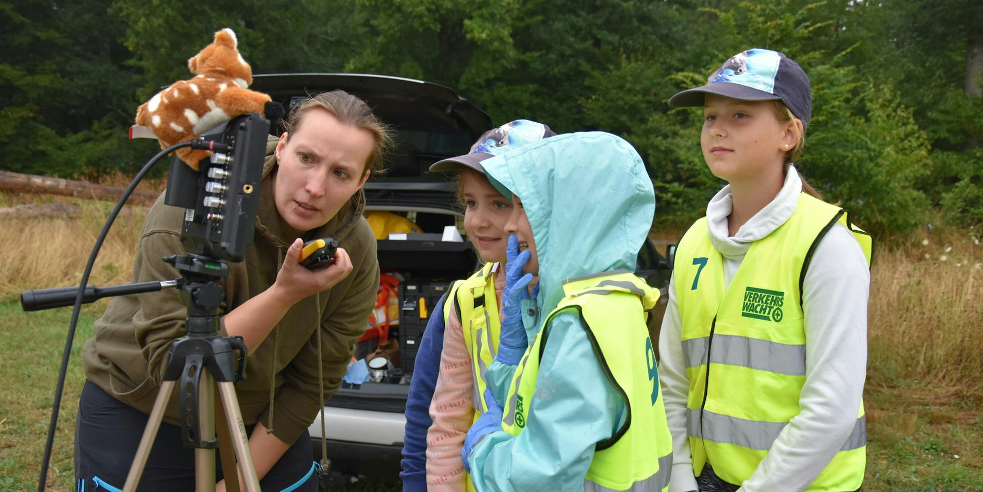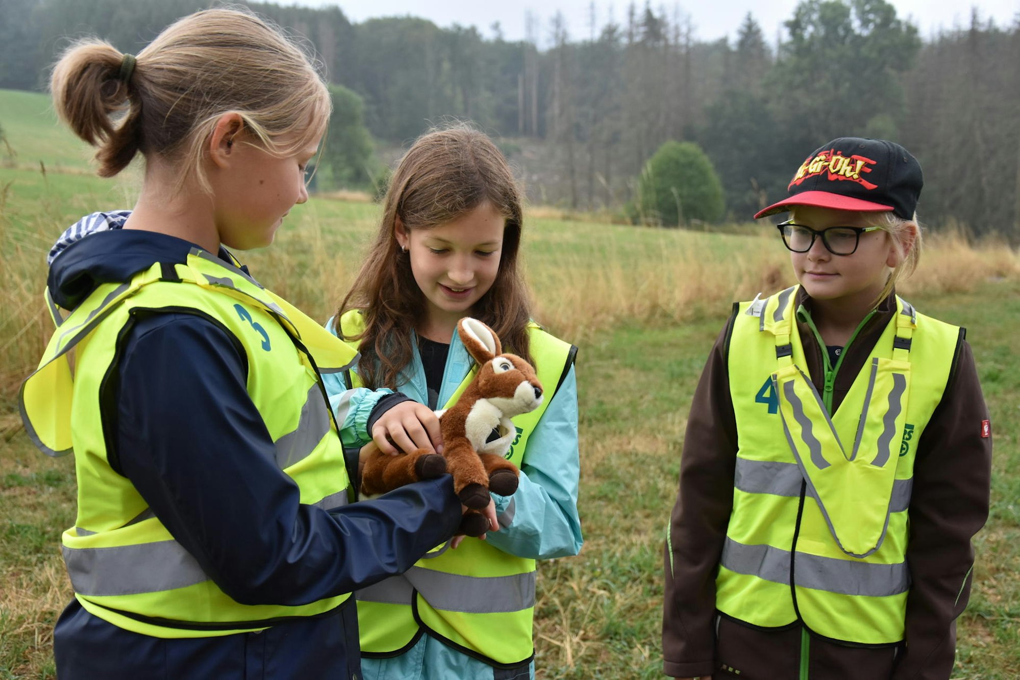 „Jetzt sind die Rehkitze schon recht groß und mobil und die Wiesen sind gemäht, also werden wir vielleicht einem Fuchs oder auch Hasen begegnen, aber wahrscheinlich keinem kleinen Rehkitz mehr“, erklärte Menge-Voss den zehn bis zwölf Jahre alten Naturfreundinnen und Naturfreunden zum Auftakt. „Aber ansonsten sollte die Situation so echt wie möglich sein.“