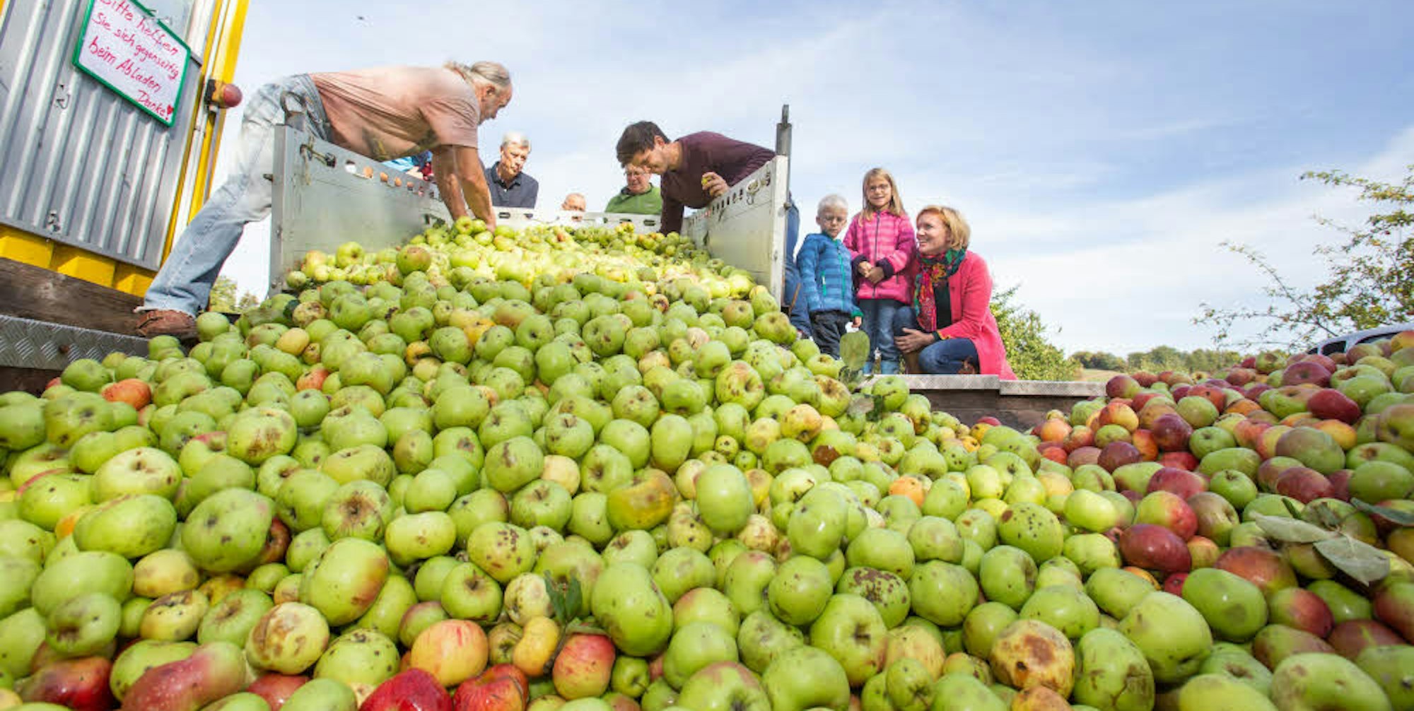 Auch Sarah Zentara aus Wiehl freut sich über ihre Ernte. Die 34-Jährige konnte mit ihren Kindern Paul und Mia mehr als 460 Kilogramm Äpfel ernten. „Zu Hause stehen sieben Bäume, die wir jährlich abernten. Dabei bleibt so viel übrig, das wir dann immer zur Kelterei fahren.“ Dafür erhält die Wiehlerin Apfelsaft als Lohn. Darauf freuen sich Christian und Melanie Söhnchen aus Weiershagen ebenso. Sie haben sich mit dem Auto in die lange Schlange eingereiht und warten darauf, ihre Früchte in den Sammeltrichter zu schütten. Das Paar findet es „großartig“, seit bald zehn Jahren ein regionales Unternehmen zu unterstützen. „In diesem Jahr haben wir viel Fallobst, so dass wir bisher nur 250 Kilogramm ernten konnten.“