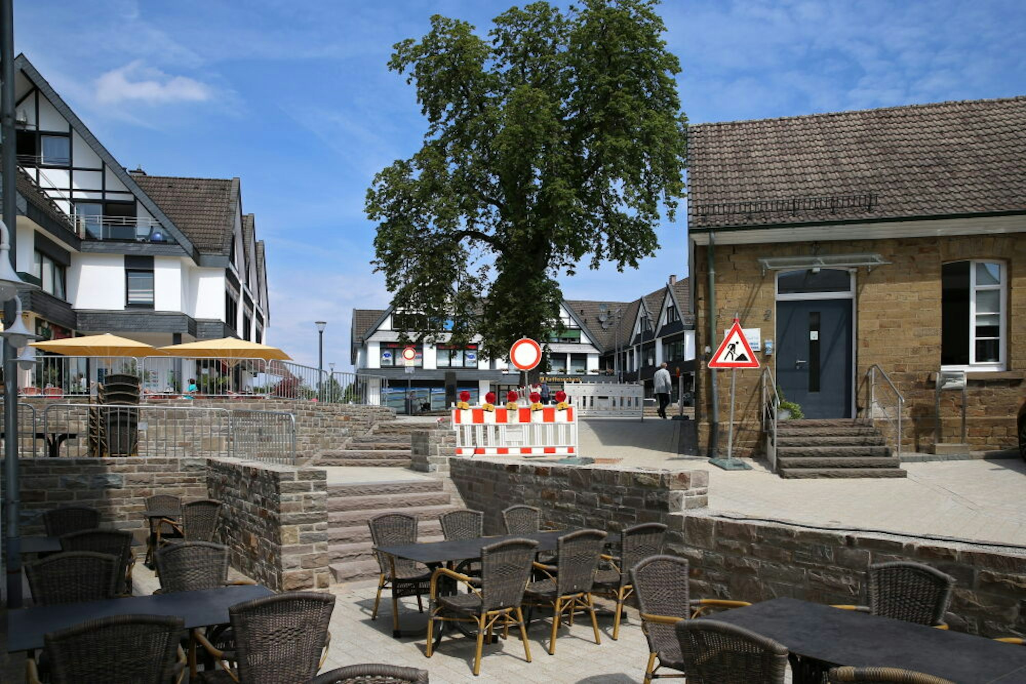 Nümbrecht – Wie ein Postkartenmotiv: Kleine Wasserfontänen sprudeln plätschernd aus dem Boden, Kinder spielen unter der großen Kastanie, die Eltern sitzen auf Bänken daneben. Ein Eiscafé grenzt an, gegenüber öffnet sich in Nümbrechts Mitte Niedens Garten, der heute zum Teil die Terrasse des Restaurants Manufaktur beherbergt. Tische unter freiem Himmel mit Blick auf den Dorfplatz der Schlossgemeinde bietet auch das Restaurant Quattro Stagioni.