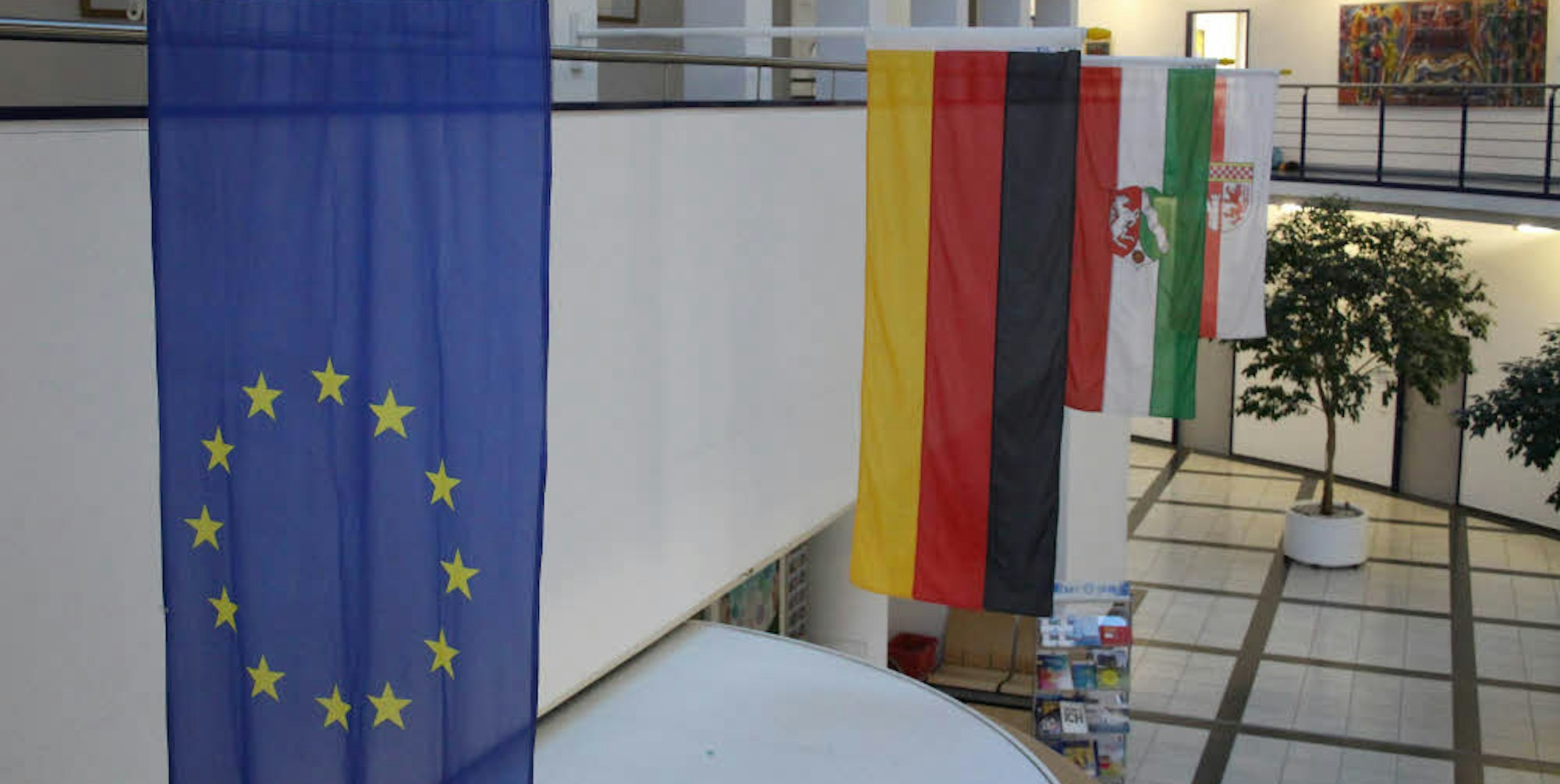 Im Foyer in Gummersbach hängt die Europafahne neben der deutschen, der von Nordrhein-Westfalen und der des Oberbergischen Kreises.