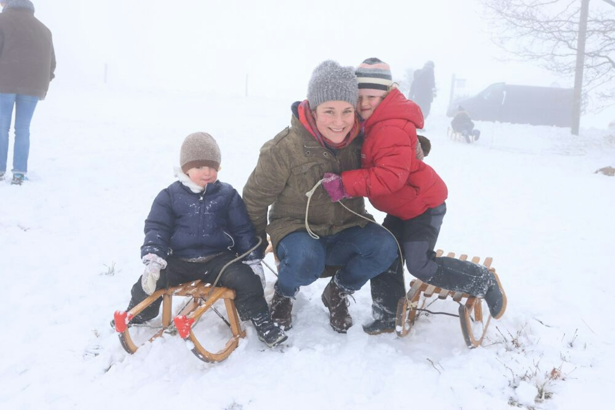 Doch nach ein paar „grünen Tagen“ sorgte neuerlicher Schneefall in der Nacht zum Sonntag für den passenden Nachschub. Da die Zufahrt zum Blockhaus nicht mehr gesperrt war, hatten sich einige Auswärtige auf den Weg in das nebelverhangene Wintersportgebiet gemacht. „Wir wollten Schnee und bei uns gab’s keinen“, freute sich Katharina Oetjen aus Bonn bei einer Rodeltour mit ihren Kindern Theo (2) und Greta (6).