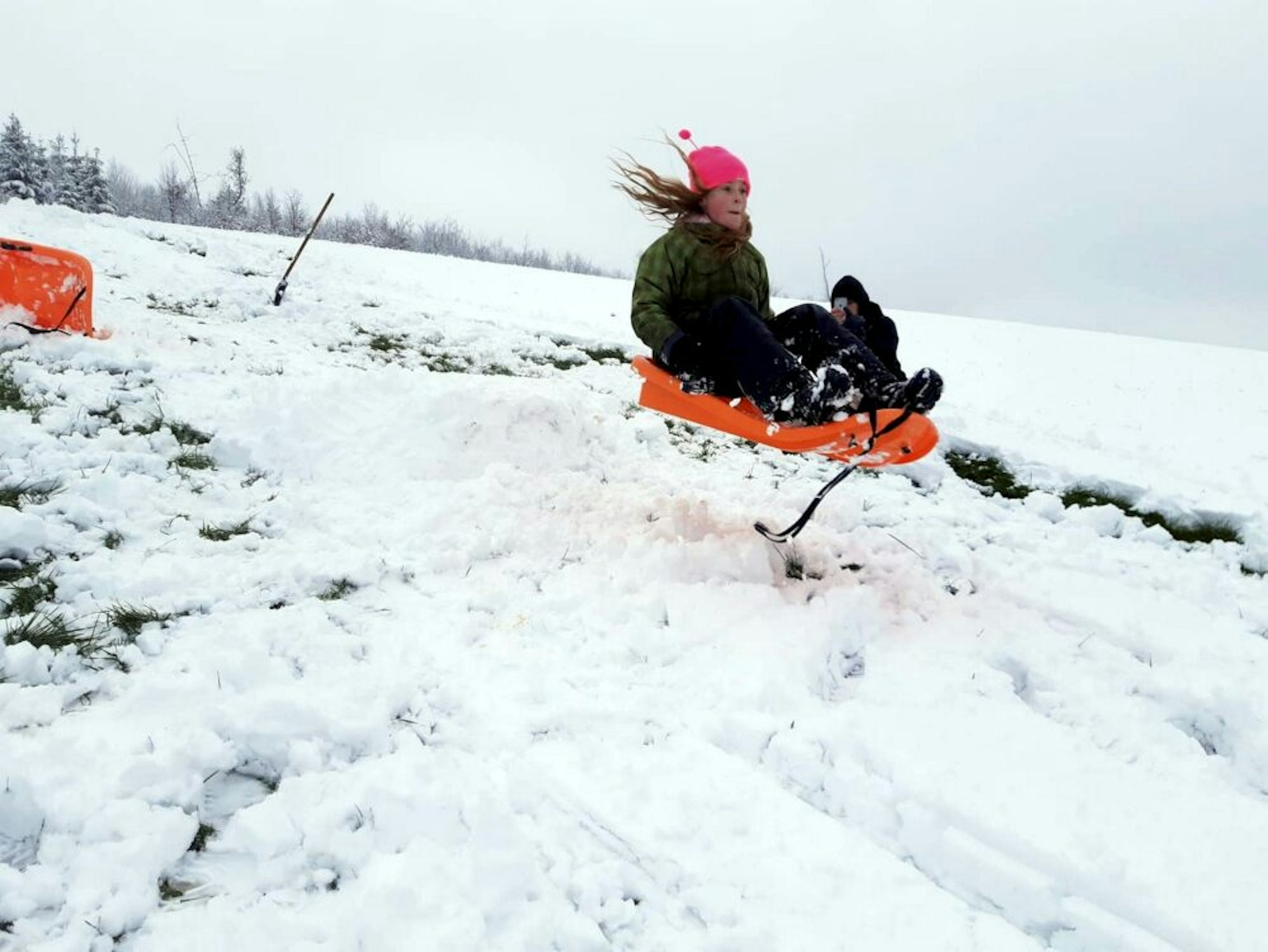 Auch wenn die Wiese noch durchscheint, die rasende Fahrt bergab machte gestern ebenso viel Spaß wie das Schneemannbauen.