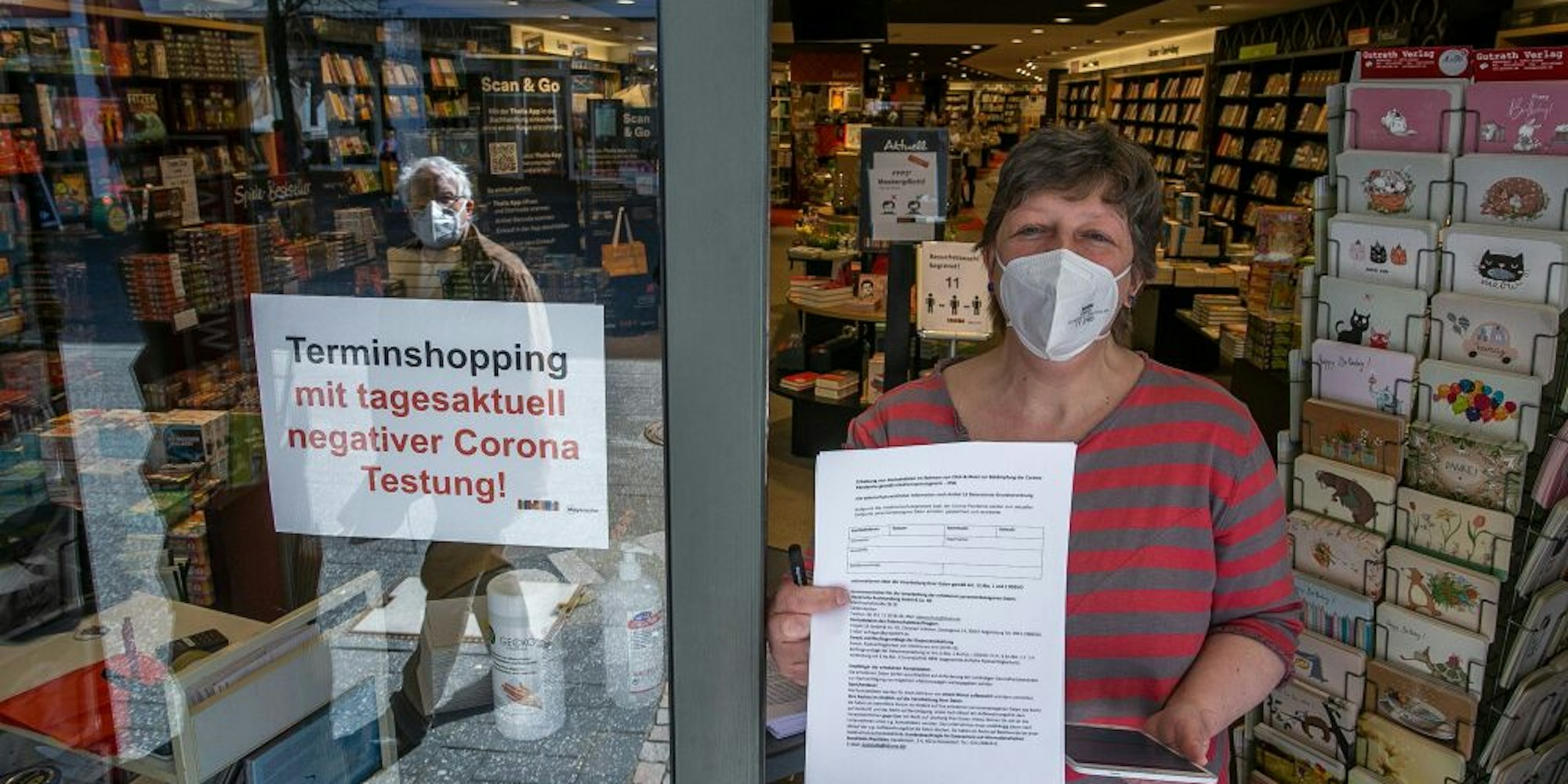 Einlass nur mit Test-Nachweis: Elke Geldmacher von der Mayerschen fragte jeden Kunden nach der Shopping-Lizenz – doch bis zur Mittagszeit hatte die niemand. Hierhin und zu vielen anderen Geschäften kamen die Kunden nur, um Bestelltes an der Tür abzuholen.